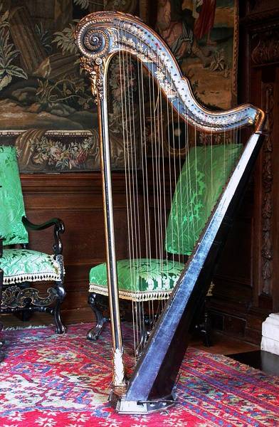 1780年漆面镀金木竖琴,金叶与黑漆形成鲜明对比,顶部装饰有新古典主义中国风的茛菪叶滚边。