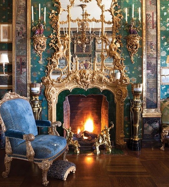 Ann Getty房间壁炉两边的窄长壁纸,描绘了中国古代庭院。