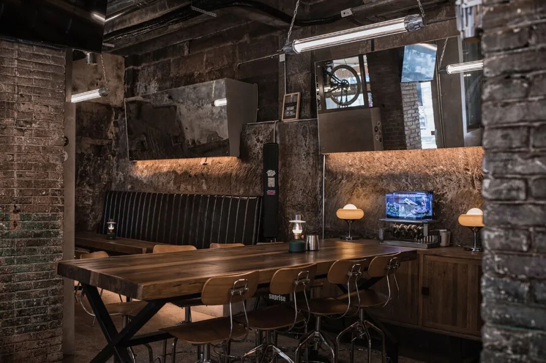 减法完成之后,是加法的开始。对于整个风格的定义,我们偏向于与老建筑的融合而非冲突。加之鲜酿啤酒的文化及工业属性,我们选择了西部雅痞、工业感,机车文化作为风格走向的关键字。