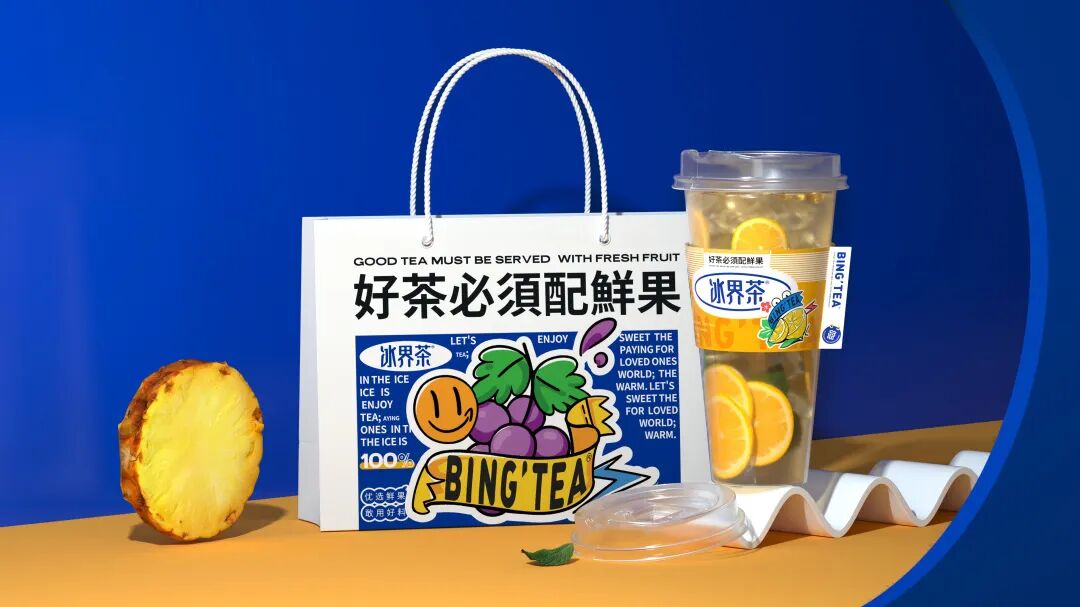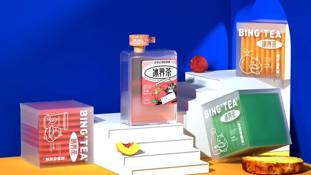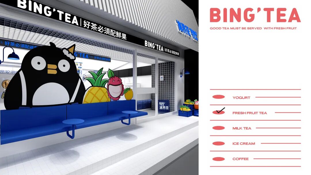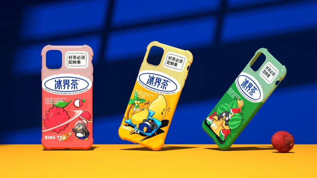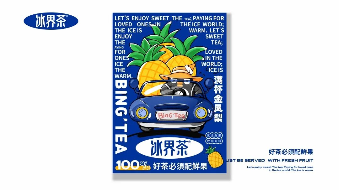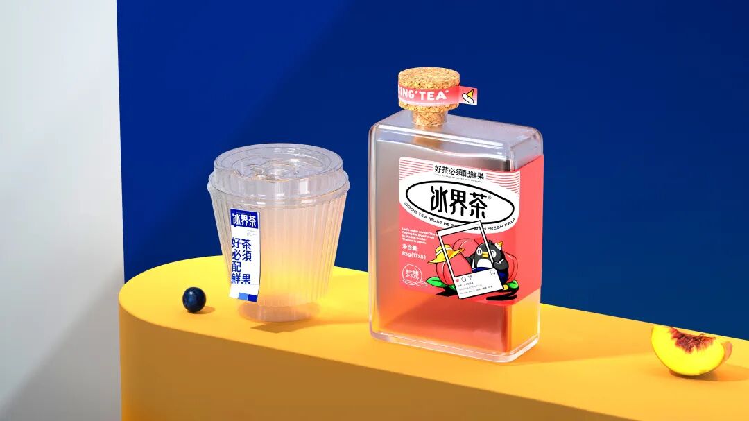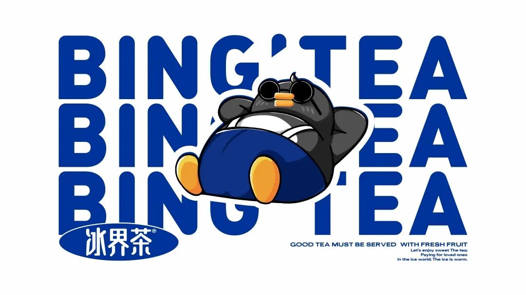 第二个案例"冰界茶"则是选用了可爱的企鹅IP形象去突出鲜果茶的冰爽感,配色上也以蓝色为主调,配上其他鲜艳的水果色,整体视觉克制但不单调,给人一股别样的冰爽感。