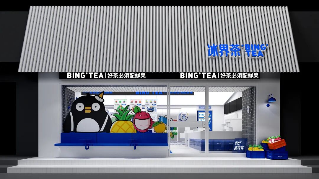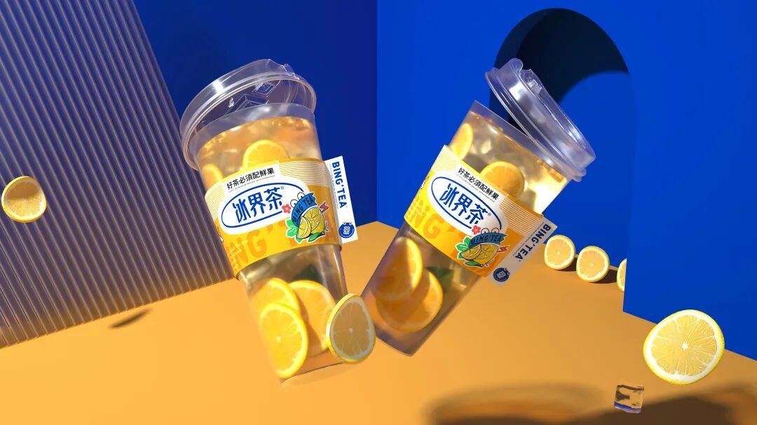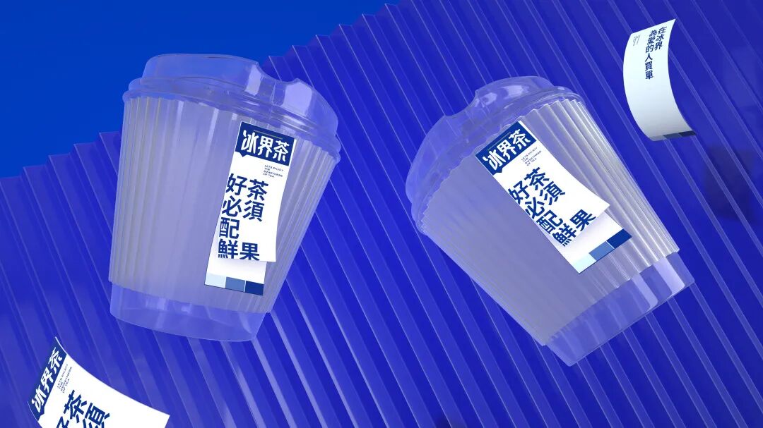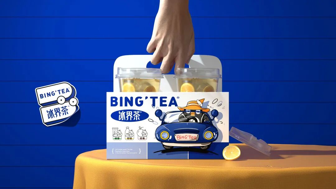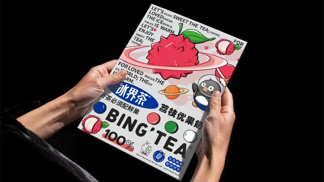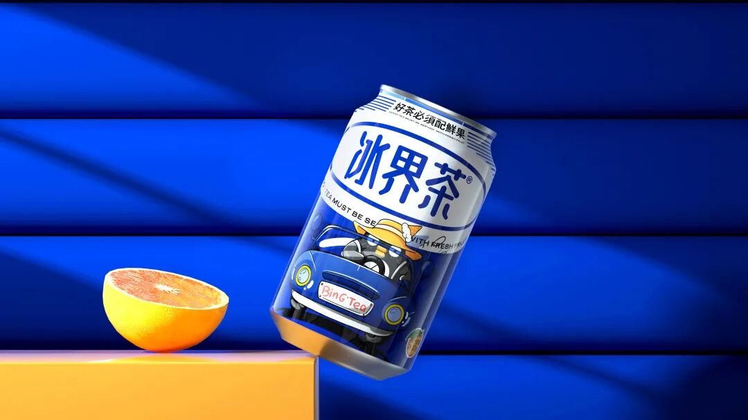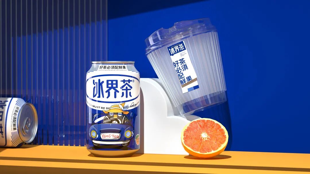 第二个案例"冰界茶"则是选用了可爱的企鹅IP形象去突出鲜果茶的冰爽感,配色上也以蓝色为主调,配上其他鲜艳的水果色,整体视觉克制但不单调,给人一股别样的冰爽感。