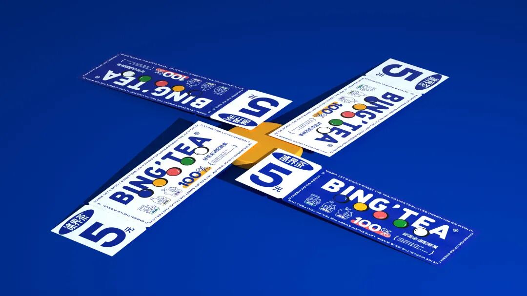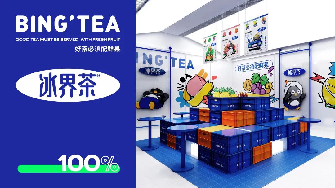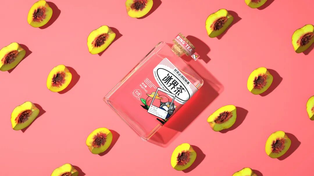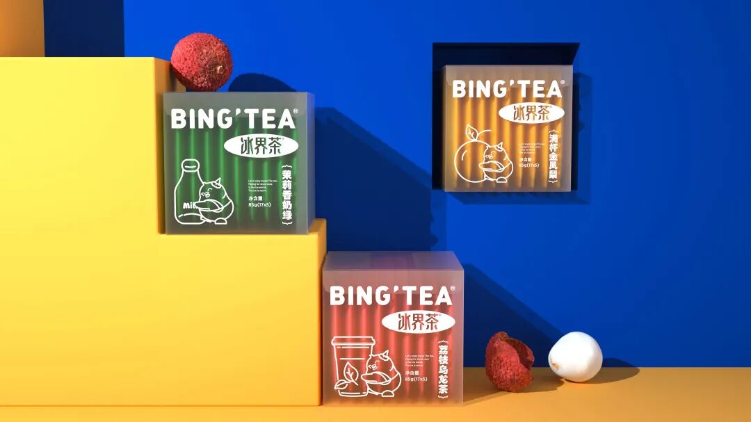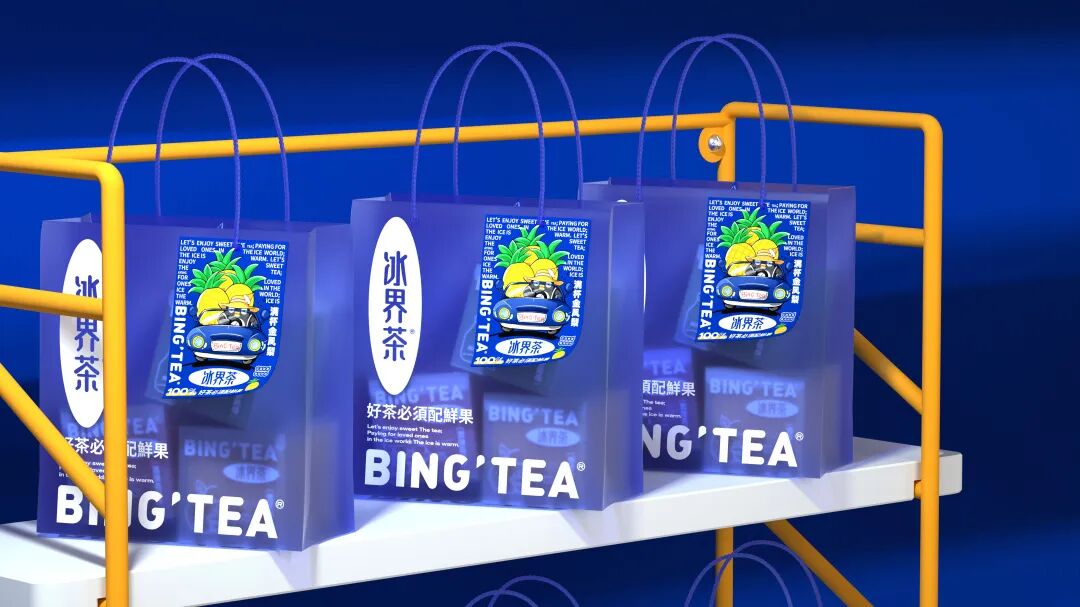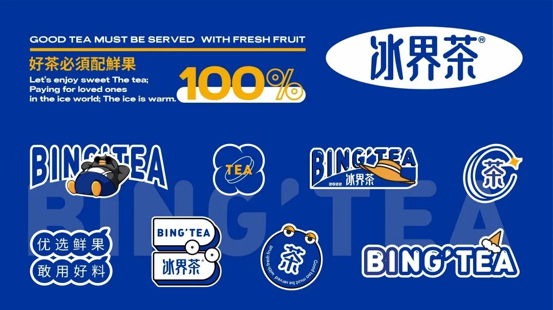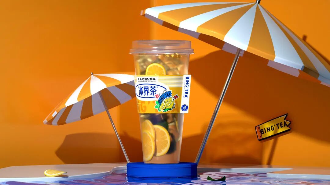 第二个案例"冰界茶"则是选用了可爱的企鹅IP形象去突出鲜果茶的冰爽感,配色上也以蓝色为主调,配上其他鲜艳的水果色,整体视觉克制但不单调,给人一股别样的冰爽感。
