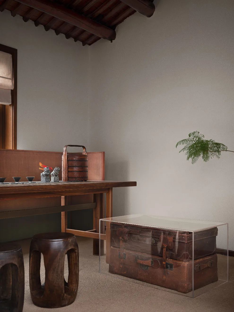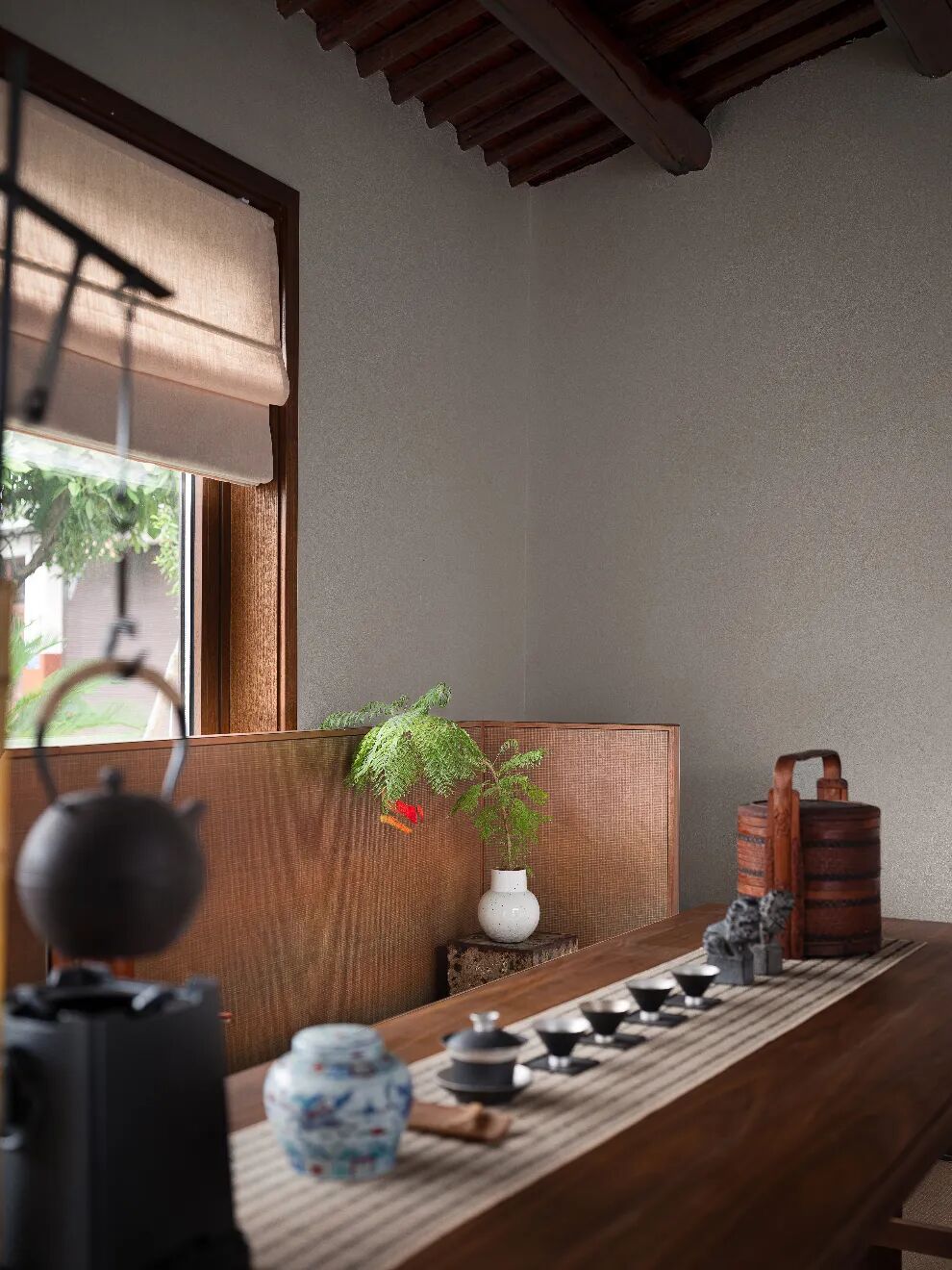 古意茶壶、茶杯、桌旗、盆景、插花等,
