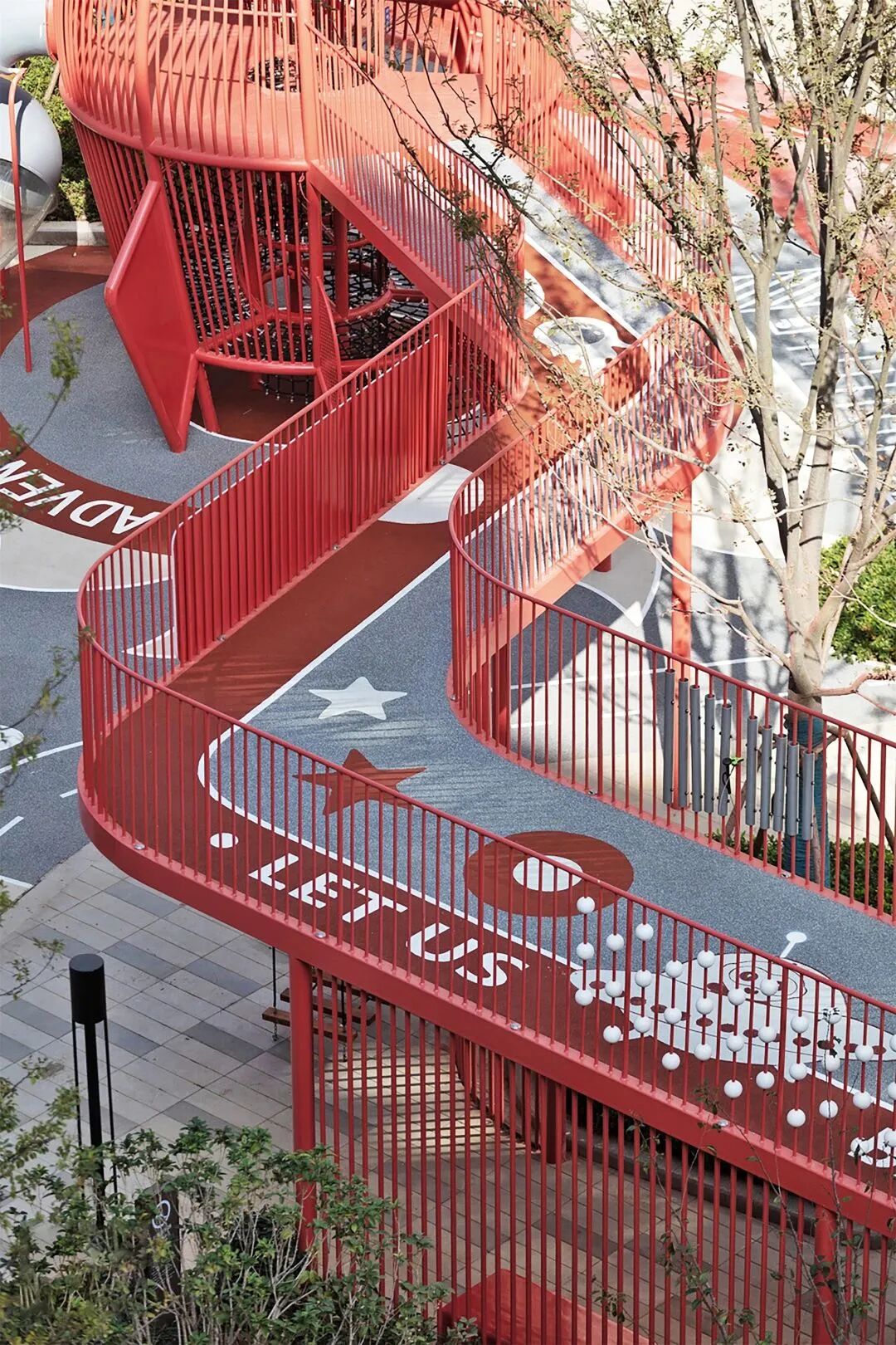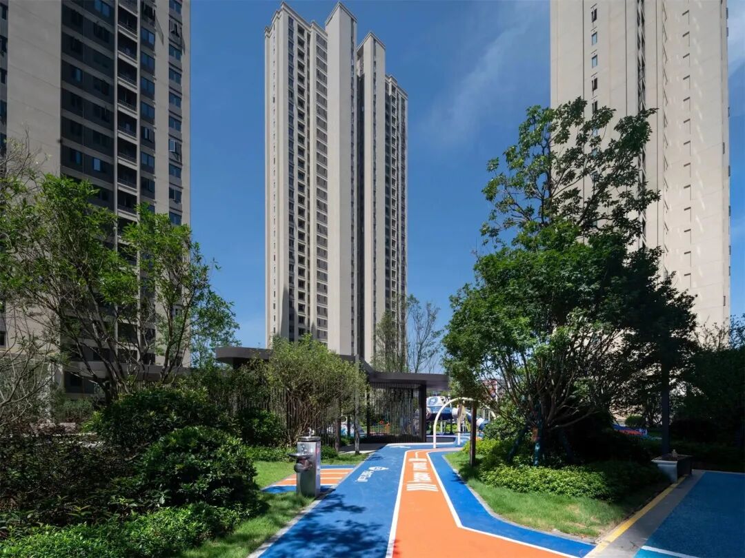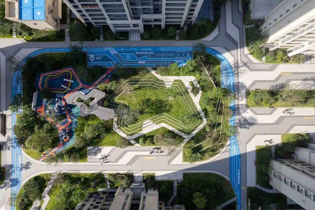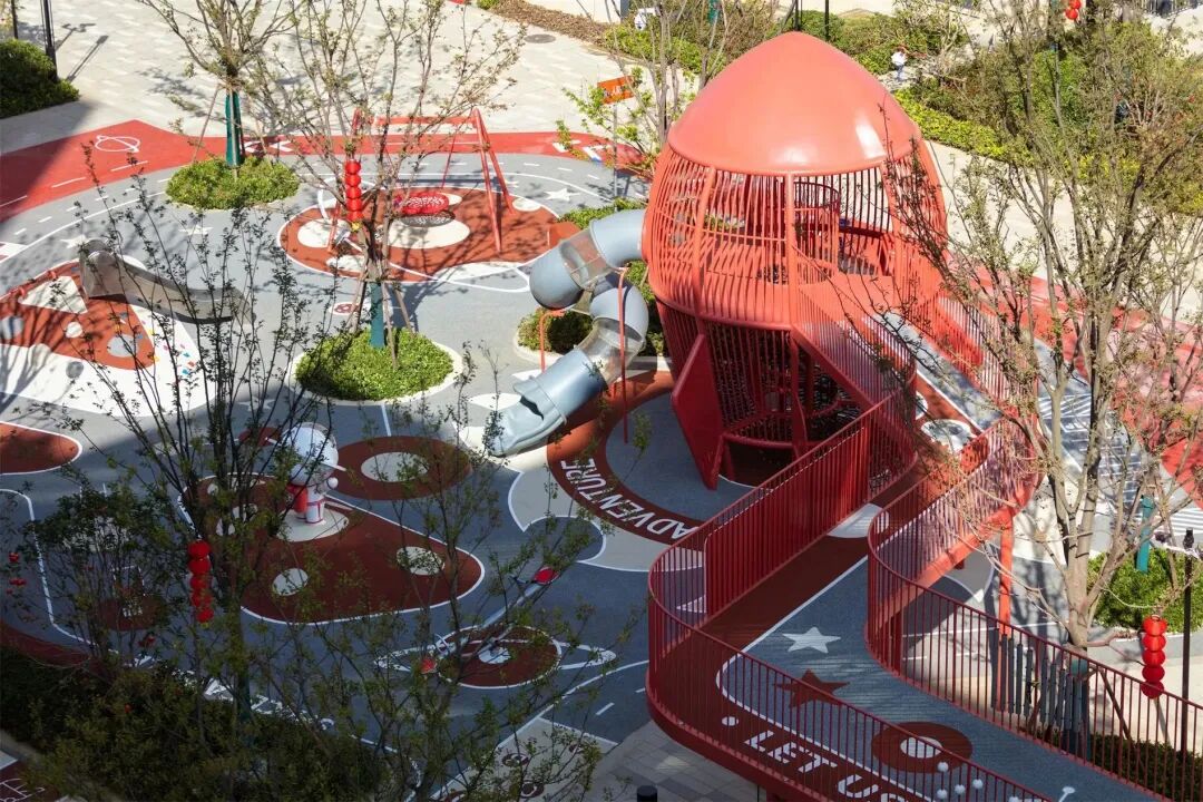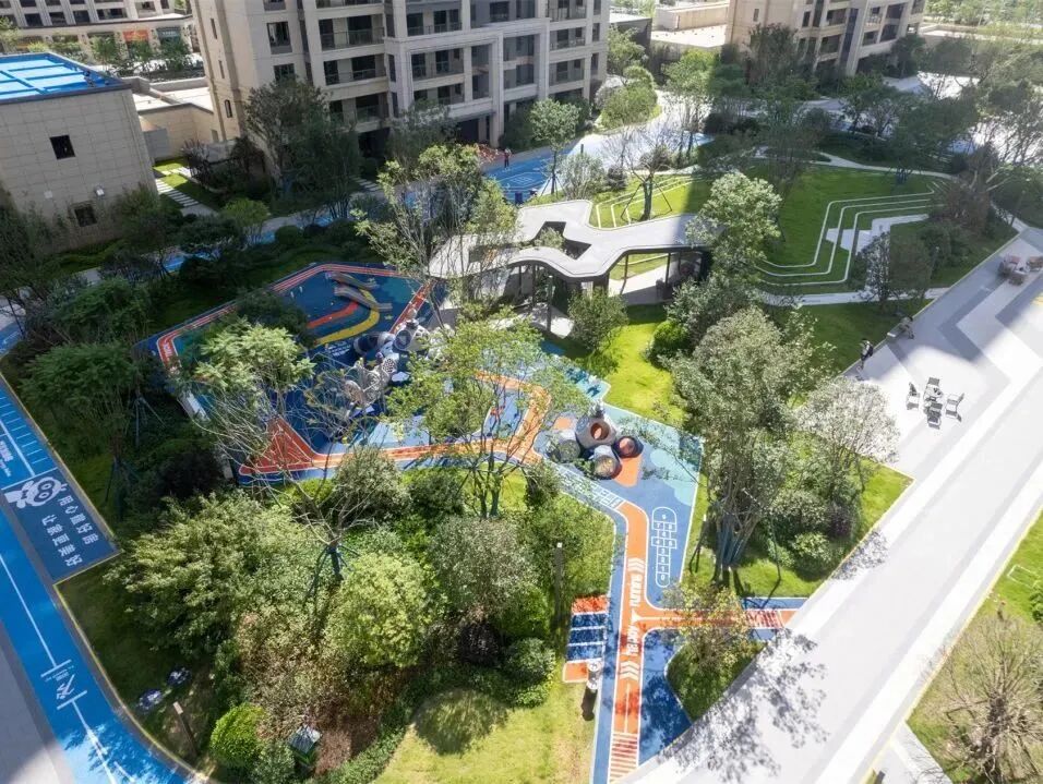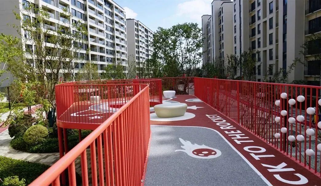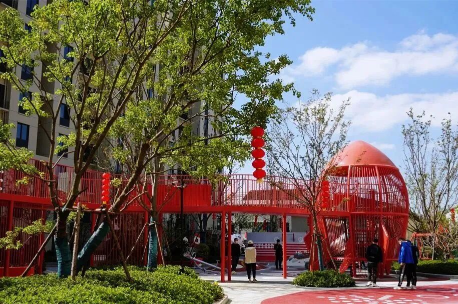 以“林”为媒介,融入“友邻·无间”的理念,以红色活力带对空间进行串联,用亮眼的主题色彩,响应缤纷生活,打造不同意境、不同功能的景观空间,为居民提供了可聚集可独享的去处。