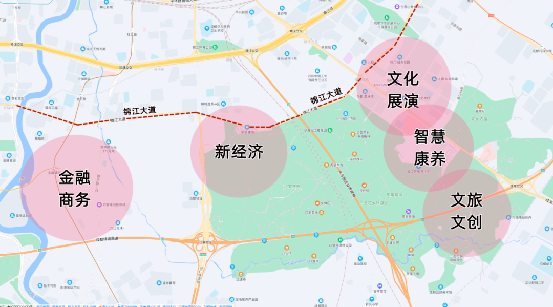 锦江108.7地块所在的三圣街道,现在是白鹭湾新经济总部功能区的一部分,布局有“一道九园”中的智慧康养产业园,将重点发展大健康、文商旅体等产业,它同时还毗邻华西医院锦江院区,是锦江区规划新建的未来公园社区之一,地位超然。