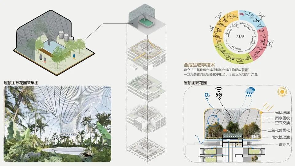 首先,“游牧计划”通过可移动的“游庐”来提高城市空间使用效能,进而减少资源浪费、避免重复拆建的情况,也能有效缓解城市通勤问题;其次,“游庐”不仅是提供空间载体的耗能单元,还是“产能”“储能”节点,“游庐”内置光电板、储能箱、云计算单元等设备,除可供“游庐”及牧场能源使用外,还将通过外置接口将电能反哺城市;牧场内,未迁入“游庐”的空仓位,可以植入垂直农场及空中花园,通过无土栽培技术及无光种植技术,让空仓位也能有效固碳且产生经济价值;屋顶设置的固碳花园,内置雨水回收系统、光伏转化系统、植物固碳系统(吸收城市及楼宇产生的二氧化碳)及生物合成系统,通过一系列技术集成措施实现主动固碳减排。