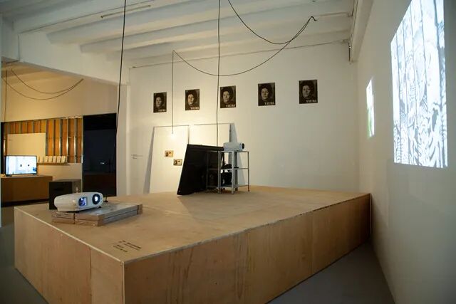 据策展人介绍,这些是由艺术家而非策展人挑选出来的作品。在此,艺术家表达的主体性被放在了第一位。作品卡板一部分倚靠在供阅读用的文献展示架上,一部分则被堆放在了工业风格的带轮分拣箱里。