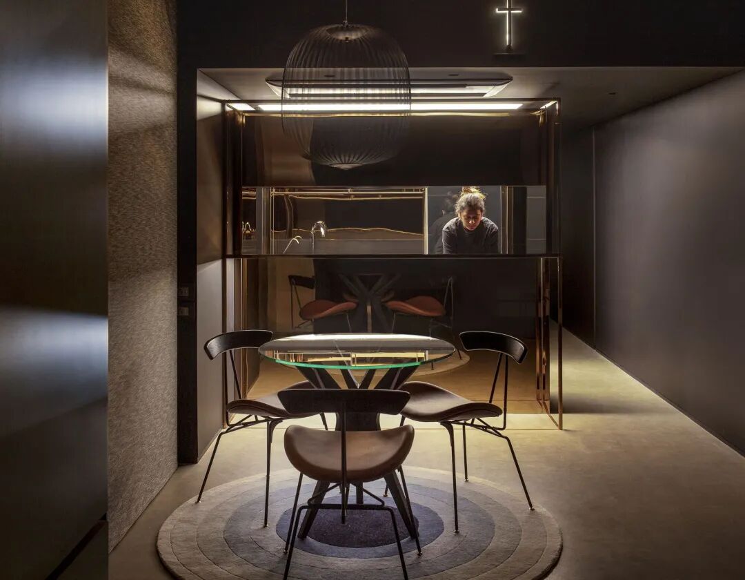 这个盒子为空间增添了温暖,因为它加强了暖色调灯光营造的舒适效果,并有助于将生活区与其他功能空间分开。在黑白浴室中使用铜色调再次重复了这一主题。