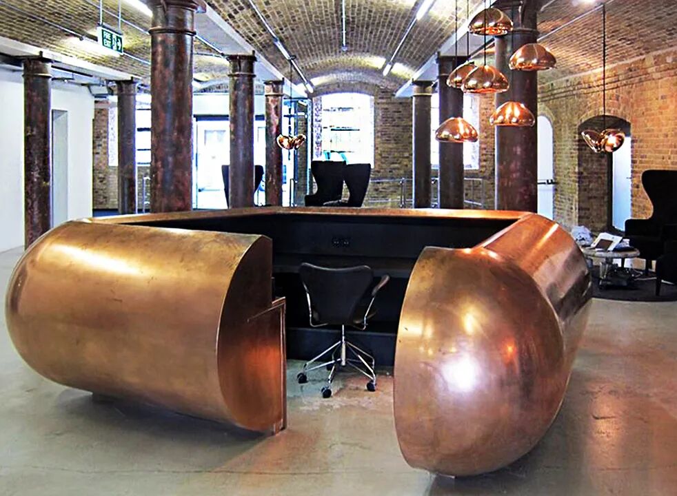铜不仅可以用于天花板和照明设备。以伦敦的这个由Mizzi Studio设计的接待区为例,令人惊叹的空间设有一张完全用铜覆盖的台子。金属的延展性使其可以弯曲成一个茧,就像一个小隔间。桌子的表面未经处理,以将其与整个空间的裸露饰面结合在一起。