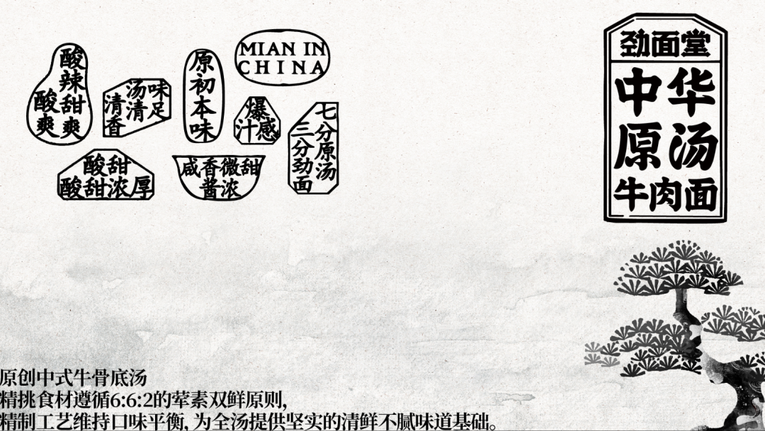 一碗好面,精华在汤、特别在汤。原汤本味,是高品质食材味道的还原,是各种风味集合与融合。面为载体、融进汤里,每一口都承载着原汤食材本味,每一口都在和味蕾直面坦白。原汤背后,体现的是劲面堂中华原汤牛肉面,对产品品质的坚持、以及对每一个顾客的坦诚。