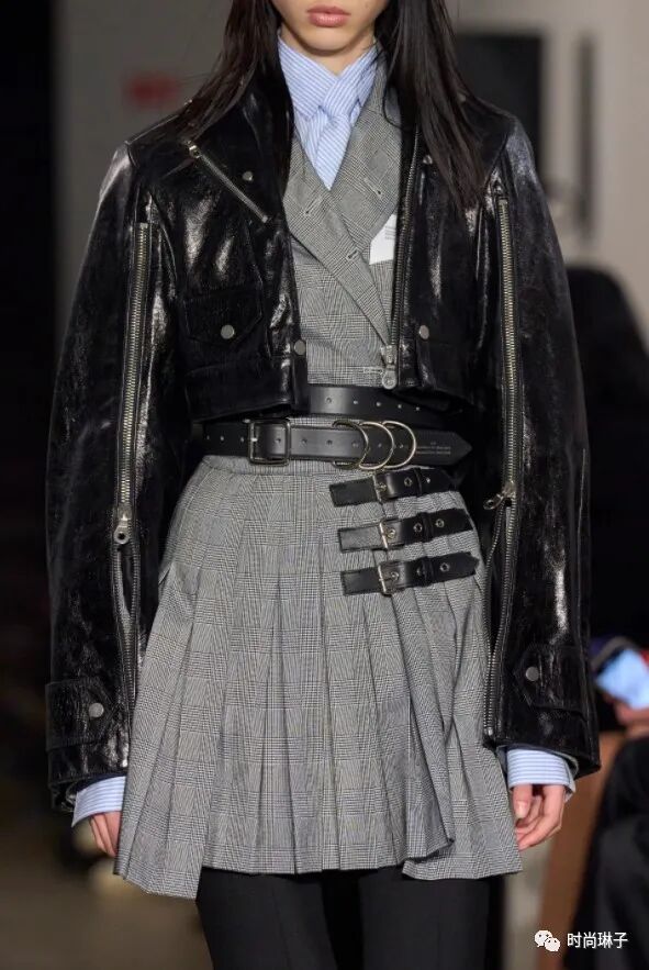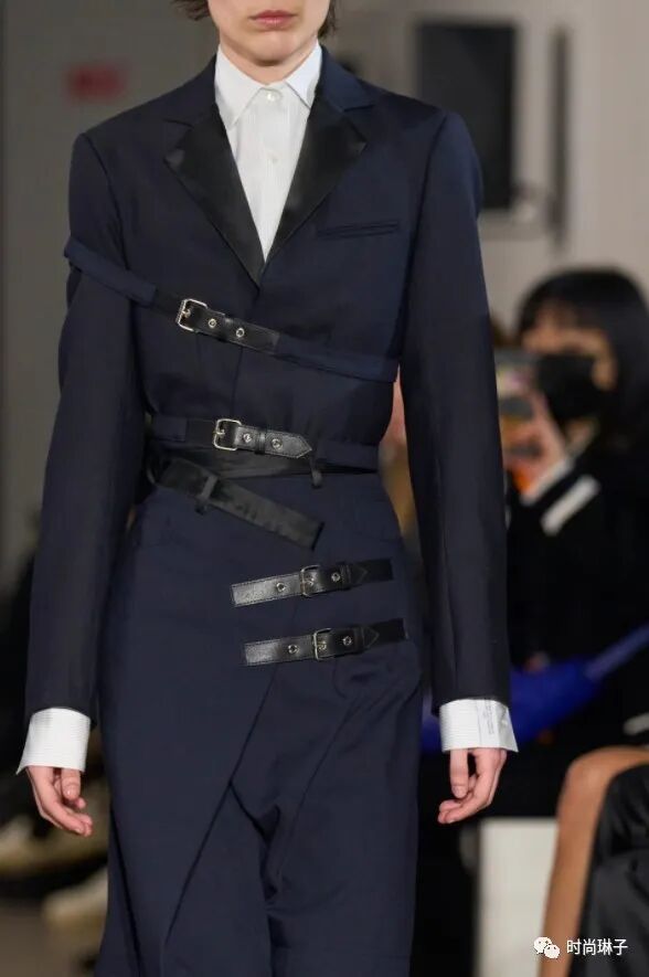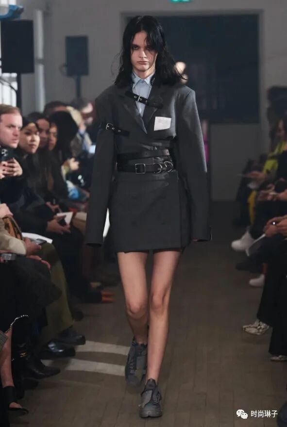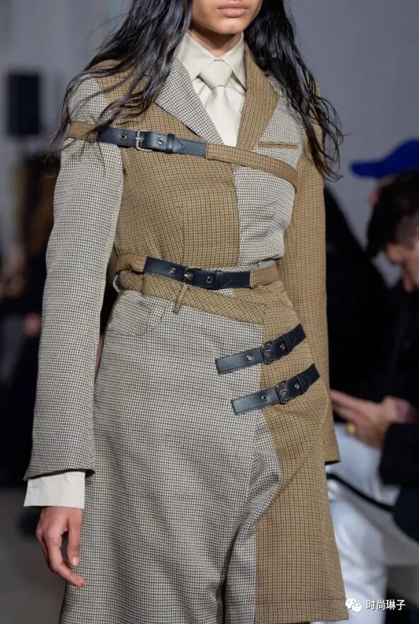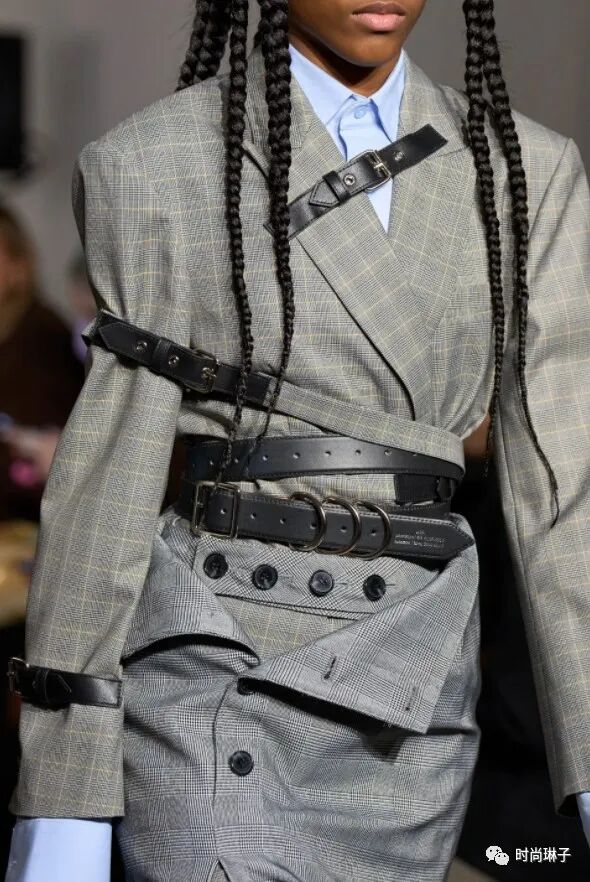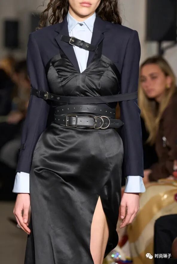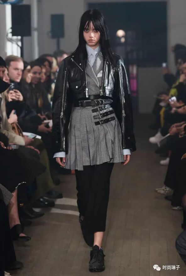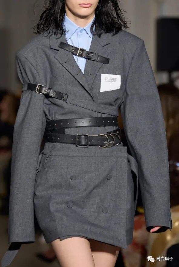 品牌标志性的解构设计外套与裙装搭配贯穿整个系列的皮革束带金属搭扣,领带衬衣搭配朋克风的皮革夹克或铆钉大衣,极富个性魅力。