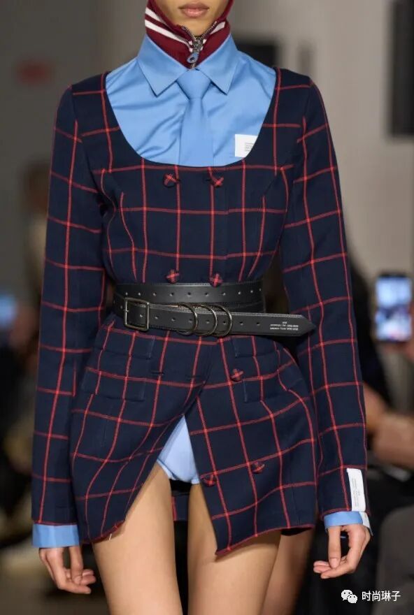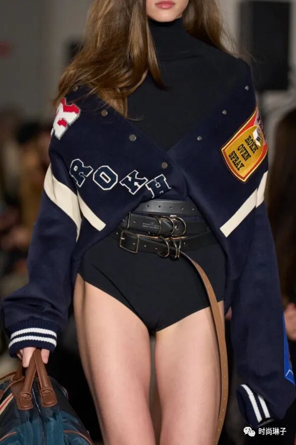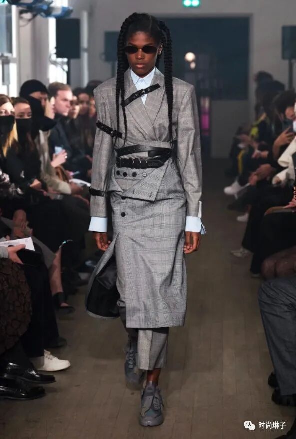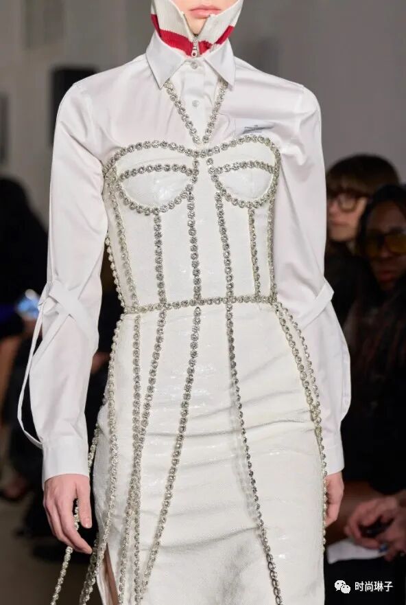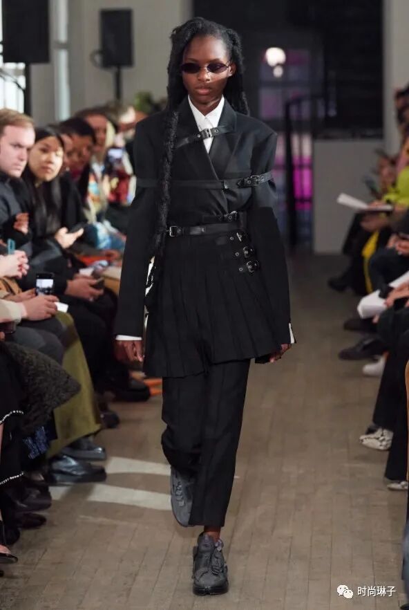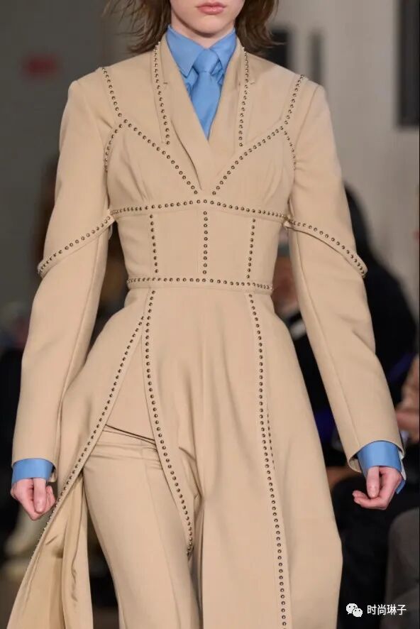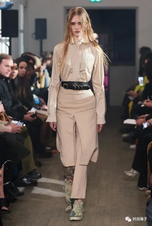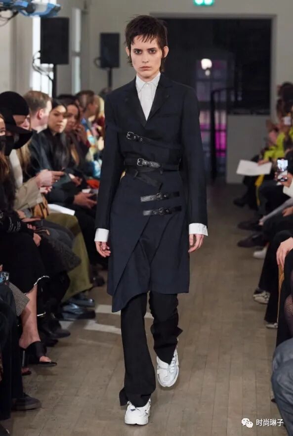 品牌标志性的解构设计外套与裙装搭配贯穿整个系列的皮革束带金属搭扣,领带衬衣搭配朋克风的皮革夹克或铆钉大衣,极富个性魅力。