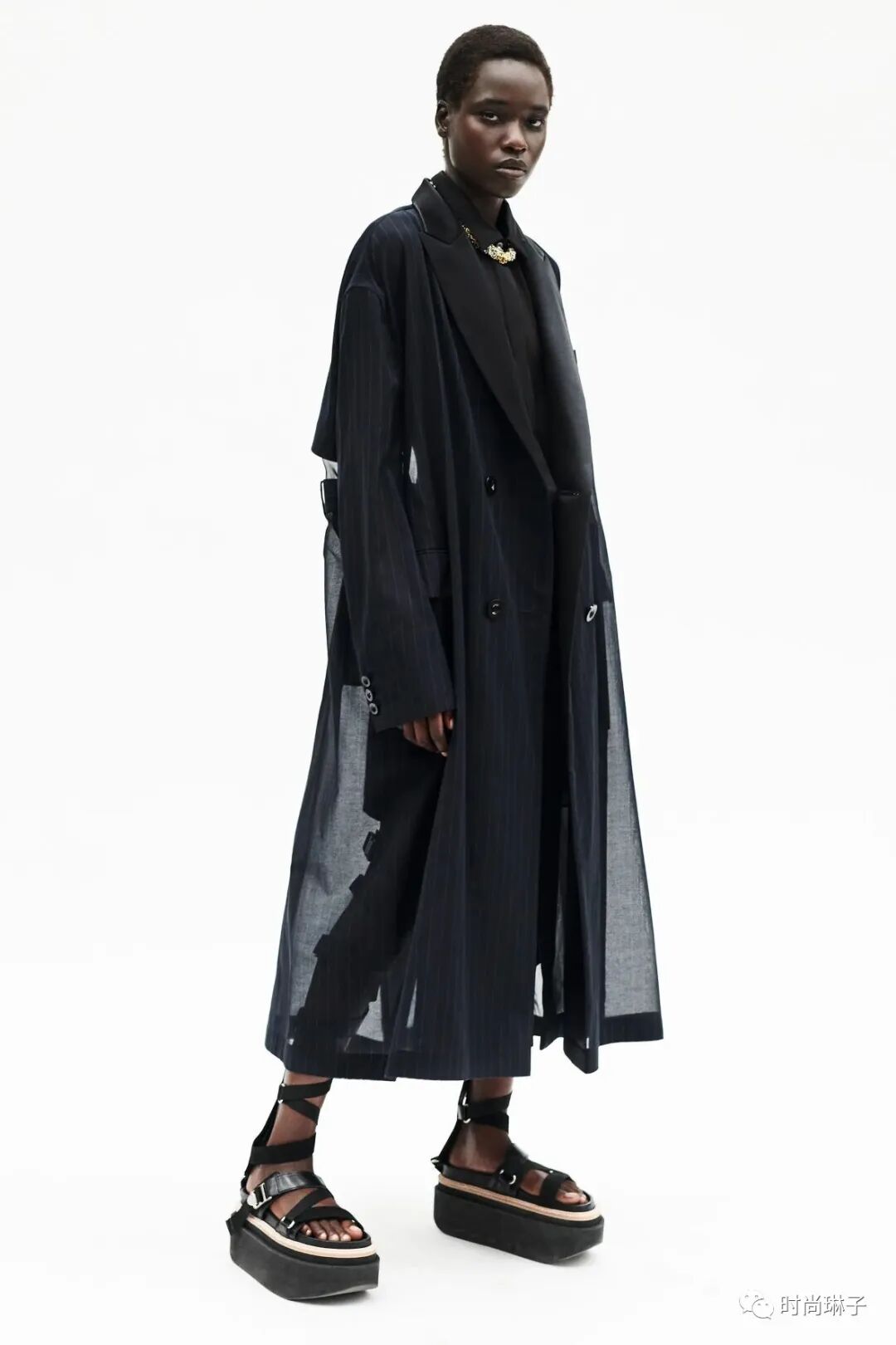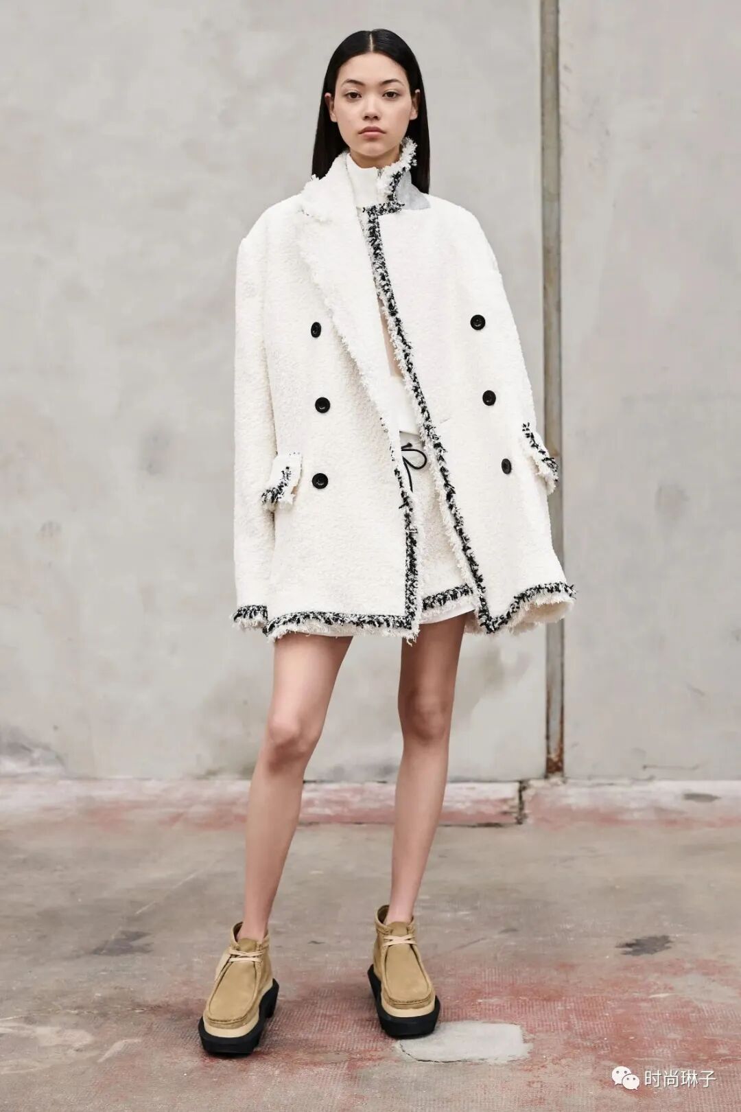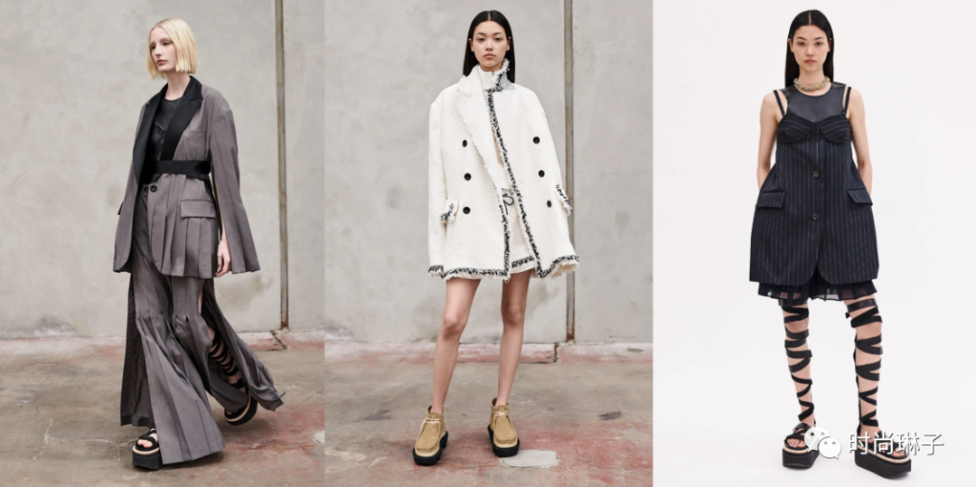 Sacai 2023早春系列女装延续了设计师阿部千登势一如既往的解构设计,将经典的廓形进行混搭重构,西装/外套中的不对称设计和褶皱设计,为该系列带来了迷人的流动感。