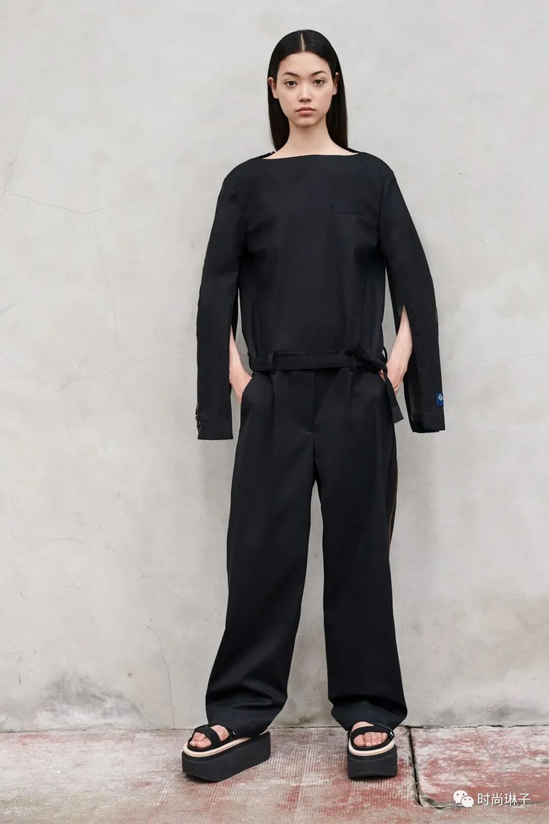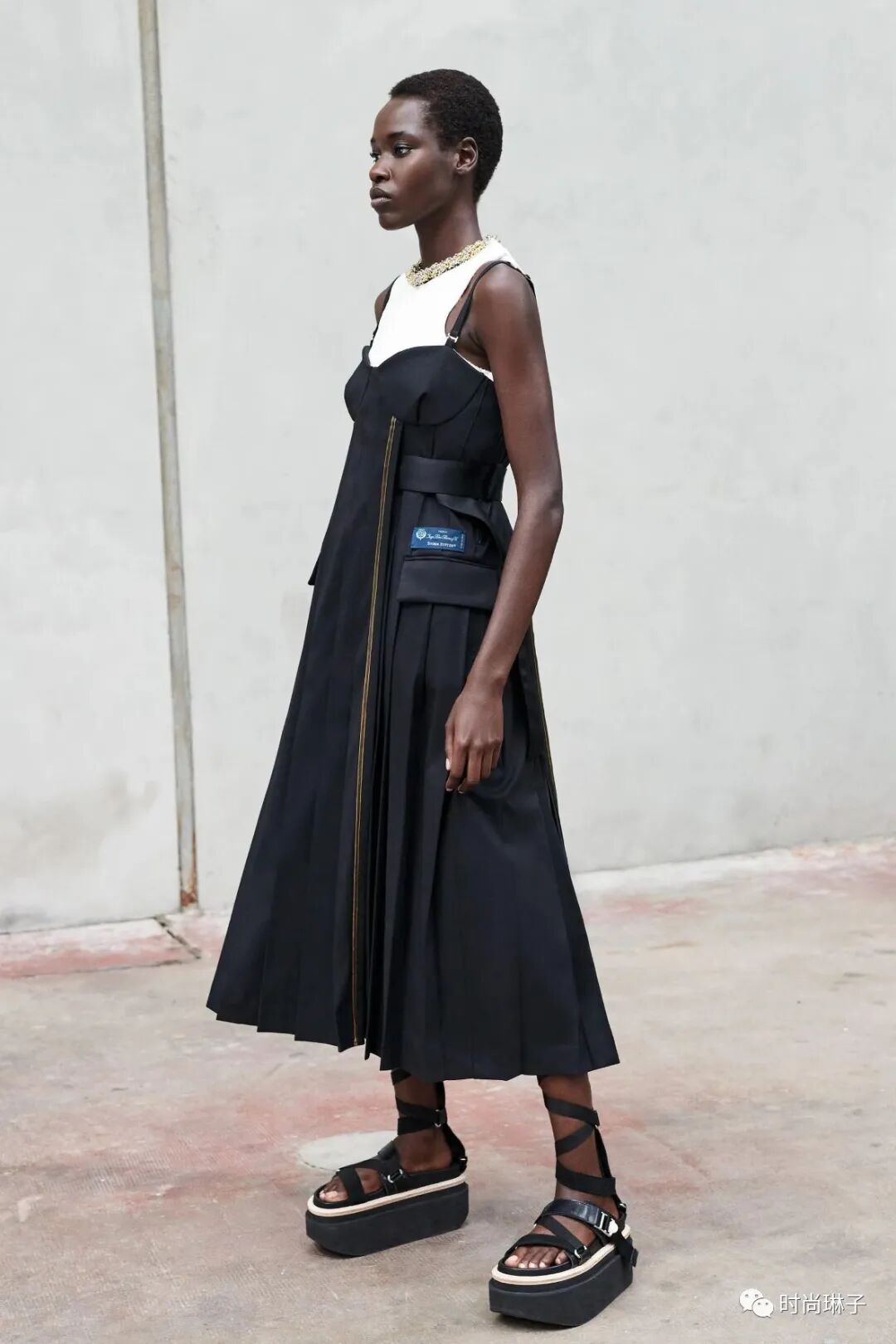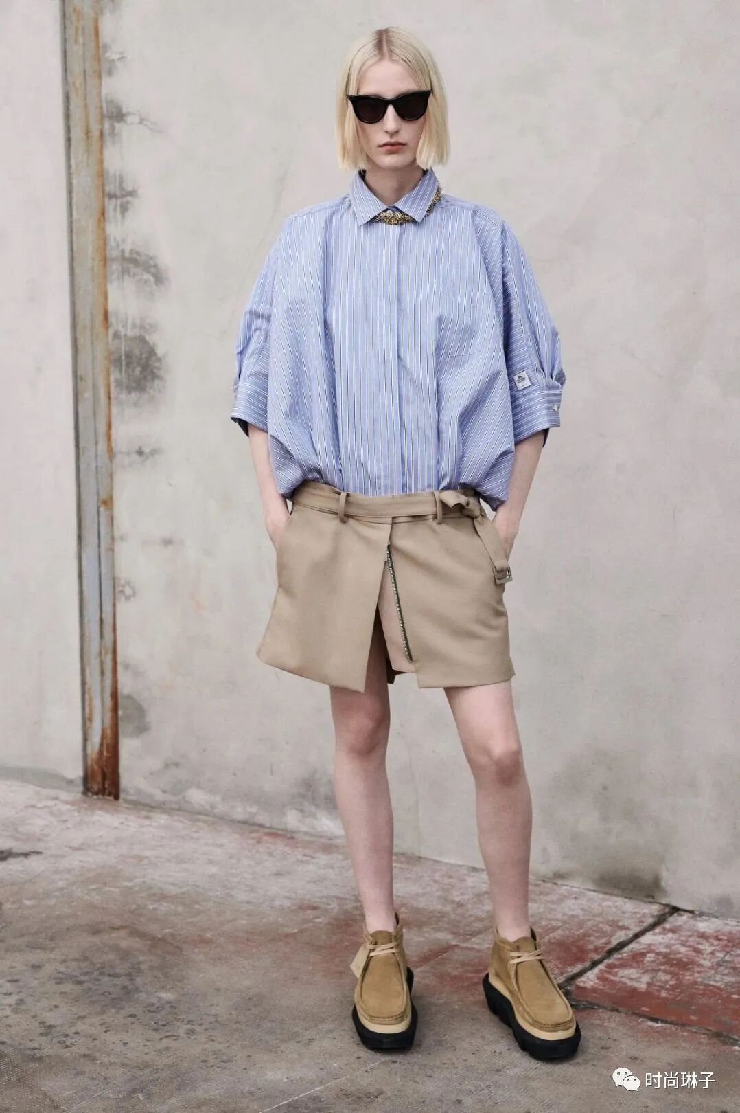 Sacai 2023早春系列女装延续了设计师阿部千登势一如既往的解构设计,将经典的廓形进行混搭重构,西装/外套中的不对称设计和褶皱设计,为该系列带来了迷人的流动感。