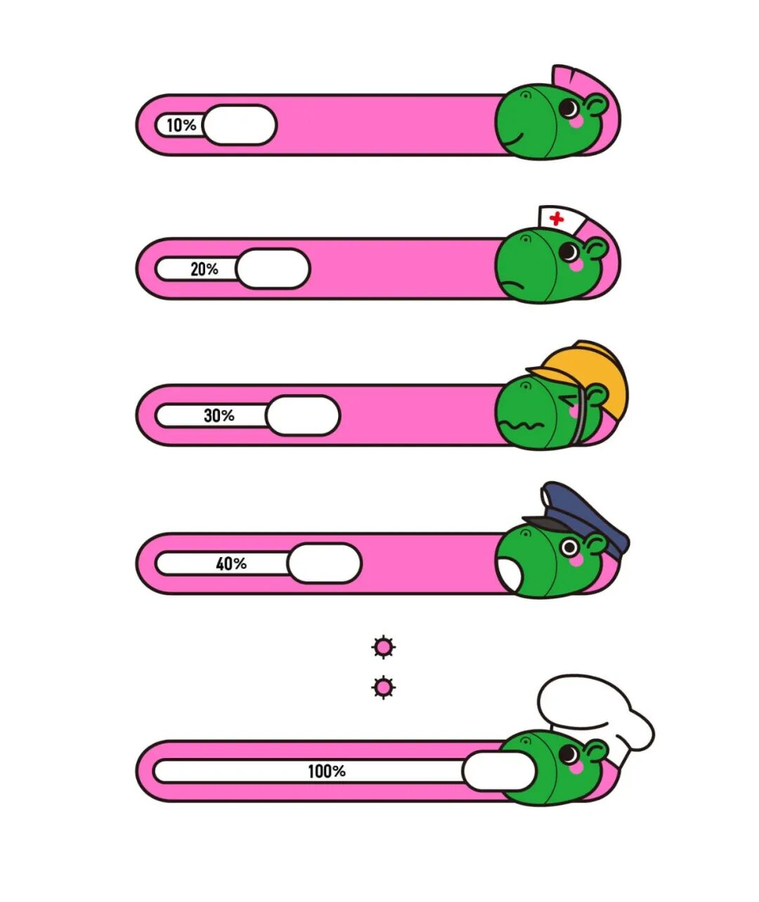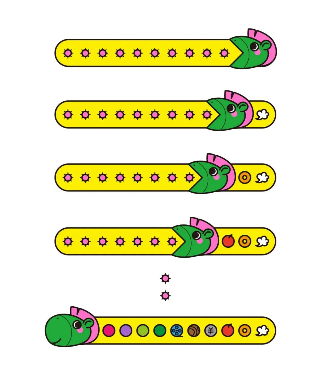 绿马大人是一只憨态可掬的绿色骏马,中绿色的皮肤,粉红色的鬃毛,加之粗黑描边,轮廓鲜明色彩浓烈,在室外清晰醒目。卡通形象能够加强人群的关注,尤其是对文字信息不精通的孩子们格外友好。如果每个间隔线按照排队行进随之变化,势必会引起排队者的持续关注。