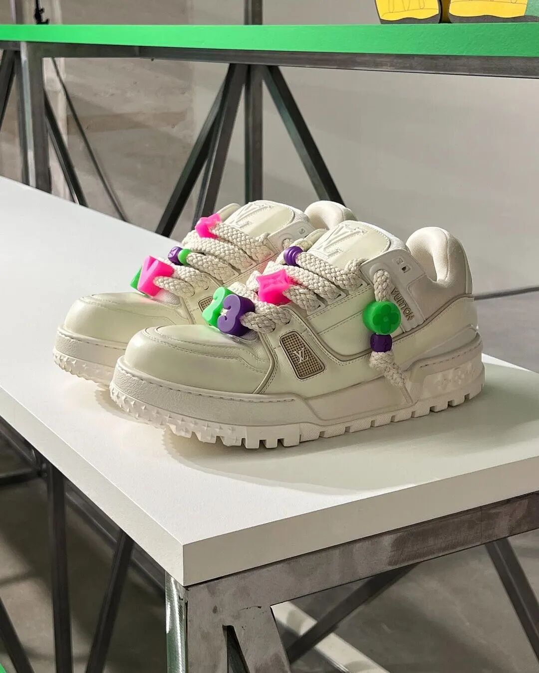如果是BALENCIAGA的新德比是米奇大头鞋,今年LOUIS VUITTON的胖版Trainer就像是小孩玩的玩具。沿用了Trainer经典的设计和鲜亮的色彩的同时,将其整体放大并配上了加厚的鞋底,给人了一种雪地靴的观感。同时还献上了真•雪地靴版本的Snow系列。球鞋版本的新Trainer肥肥胖胖的鞋型配上麻绳样式的鞋带和鲜艳的配饰显得童趣十足,低帮版雪地靴造型也让其比现在遍地都是的“加肥滑板鞋”更具辨识度。不得不感叹Virgil团队在最后一季球鞋设计中加入的巧思。