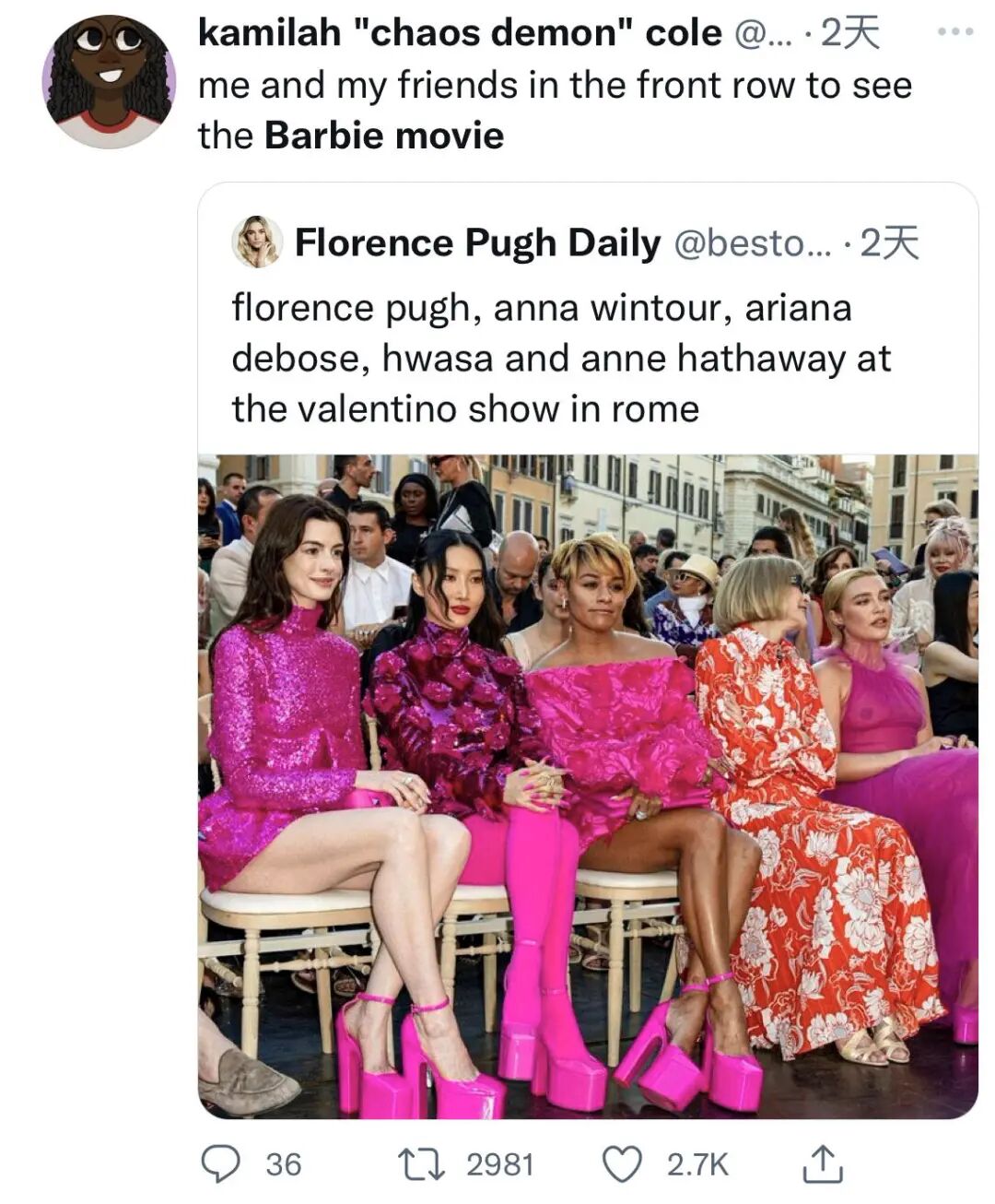 明星看秀宛若好朋友坐第一排看芭比电影。