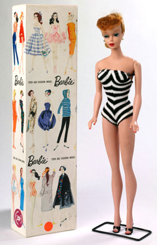1959年3月9日,第一款芭比娃娃在美国国际玩具展首次亮相,这位红唇挑眉芭比穿着黑白条纹的泳衣,其本身造型穿搭和粉色暂无关联