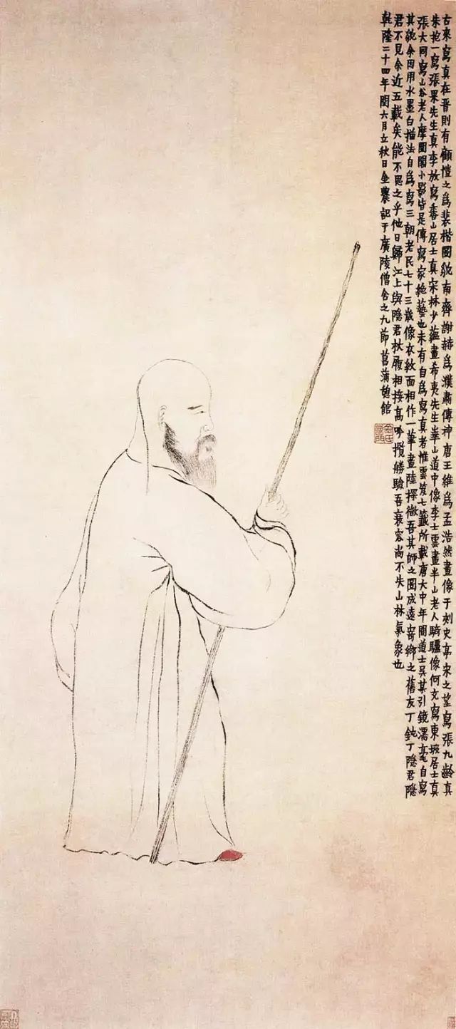 自此,金农定居扬州,悉心种植竹子和梅花,日夜不停地观察,反复写生。从一开始的写生,到后来无所不画的大境界:在金农的自画像中,他手握藤仗,徐徐迈出右脚,宽袍大袖中微微露出的红鞋暗喻了他“踏破红尘”的心境。