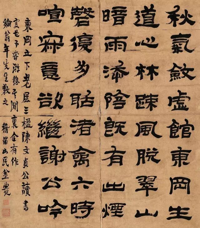 一生经历了康熙、雍正、乾隆三朝的金农,曾给自己起了“三朝老民”的闲号,在“帖学”一统天下之时,金农一如寒冬里冷梅,坚持自己古朴浑厚的书风。无论隶书、行书、楷书、漆书,金农书法里处处表现出向传统挑战的勇气。