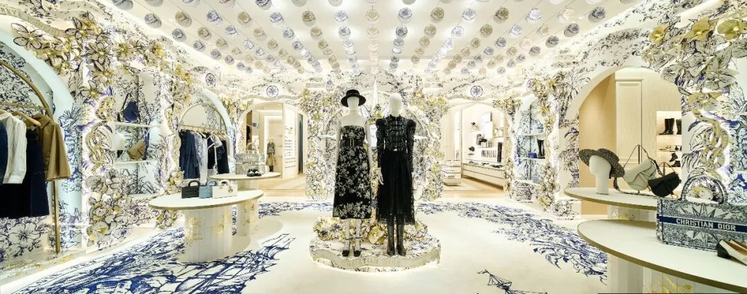 来自艺术家皮耶特罗·鲁福(PIETRO RUFFO)为迪奥二零二三早春系列所创作的RêVE D’INFINI 印花携蓝、白色调,为精品店打造梦幻置景:经典罗盘玫瑰、繁花、塞维利亚结和诗意箴言“DéPLOIE TES AILES ET RêVE D’INFINI”(“展翅翱翔,梦想无际”)等图案纷呈其上,同二零二三早春成衣系列配饰及经典作品之上的绚丽点缀巧妙呼应。