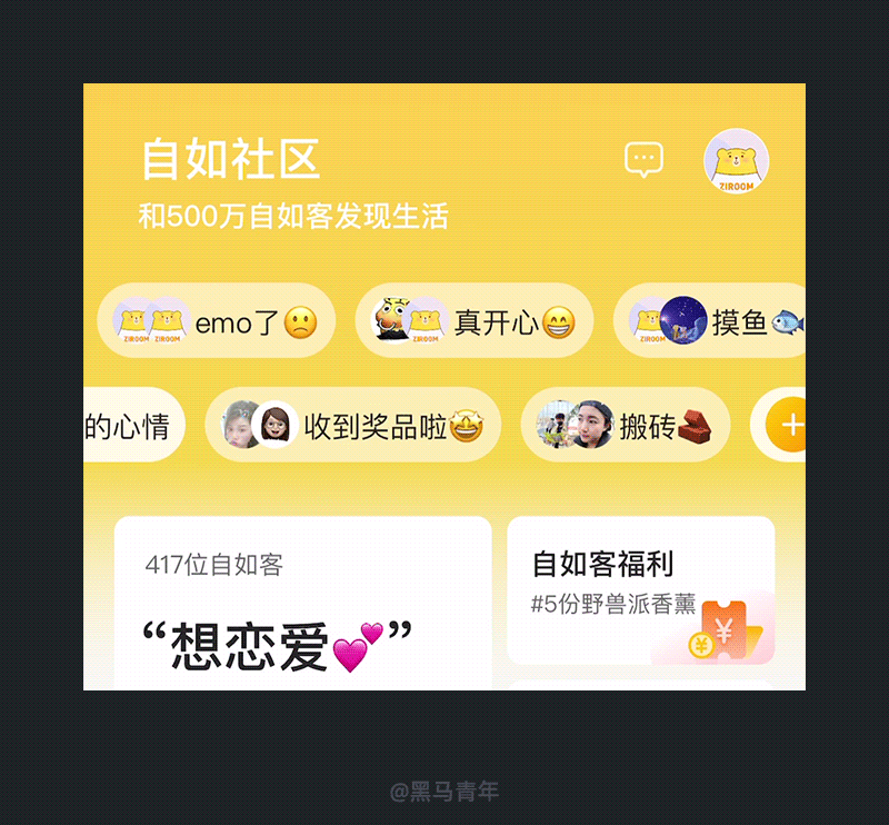 弹幕设计也可以出现在社区中,营造社区的氛围感。自如 APP 在发现生活栏目顶部视觉区域也运用了弹幕设计,以此来提高自如社区的氛围感,吸引更多用户参与分享和评论。