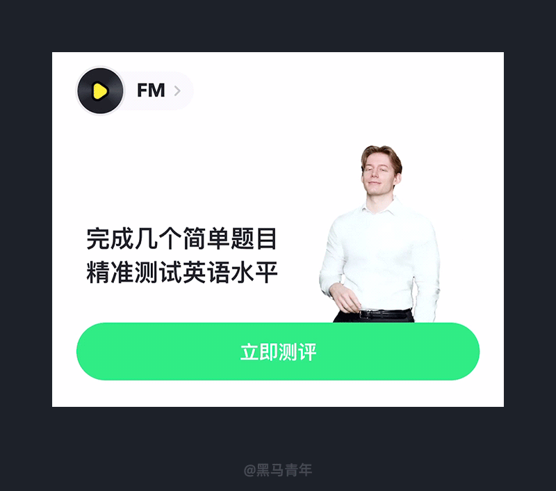 开言英语 APP 学习模块中,顶部“立即测评”区域的人物形象采用动态形式,虽然只是简单的手势指引,也比静态图片带来的关注度要高。利用动态形象提高模块的关注度,也使得设计更加生动有趣。