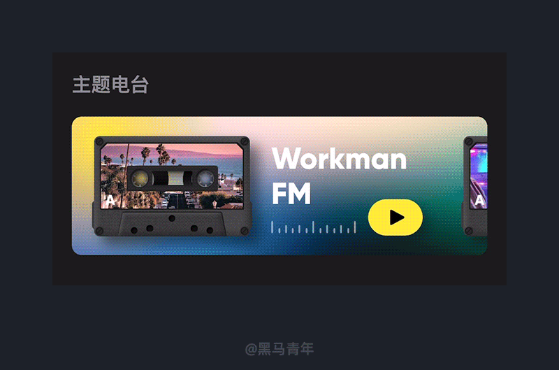 MOO 音乐在主题电台栏目,针对横向滑动切换的卡片背景做了色彩变化。利用极光风效果处理的同时,滑动的时候背景也会进行变化,色彩变化过渡自然,表现形式新颖独特。