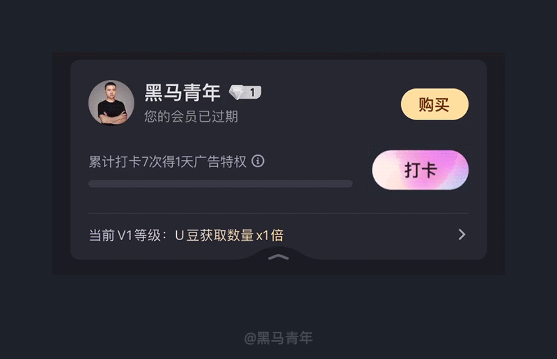 优酷 APP 在会员栏目中,将打卡按钮以动态极光风效果进行设计,提高了按钮的关注度。设计风格显得更加年轻化,动感的表达形式打破了按钮设计的常规表达,带给用户更高的感官体验。