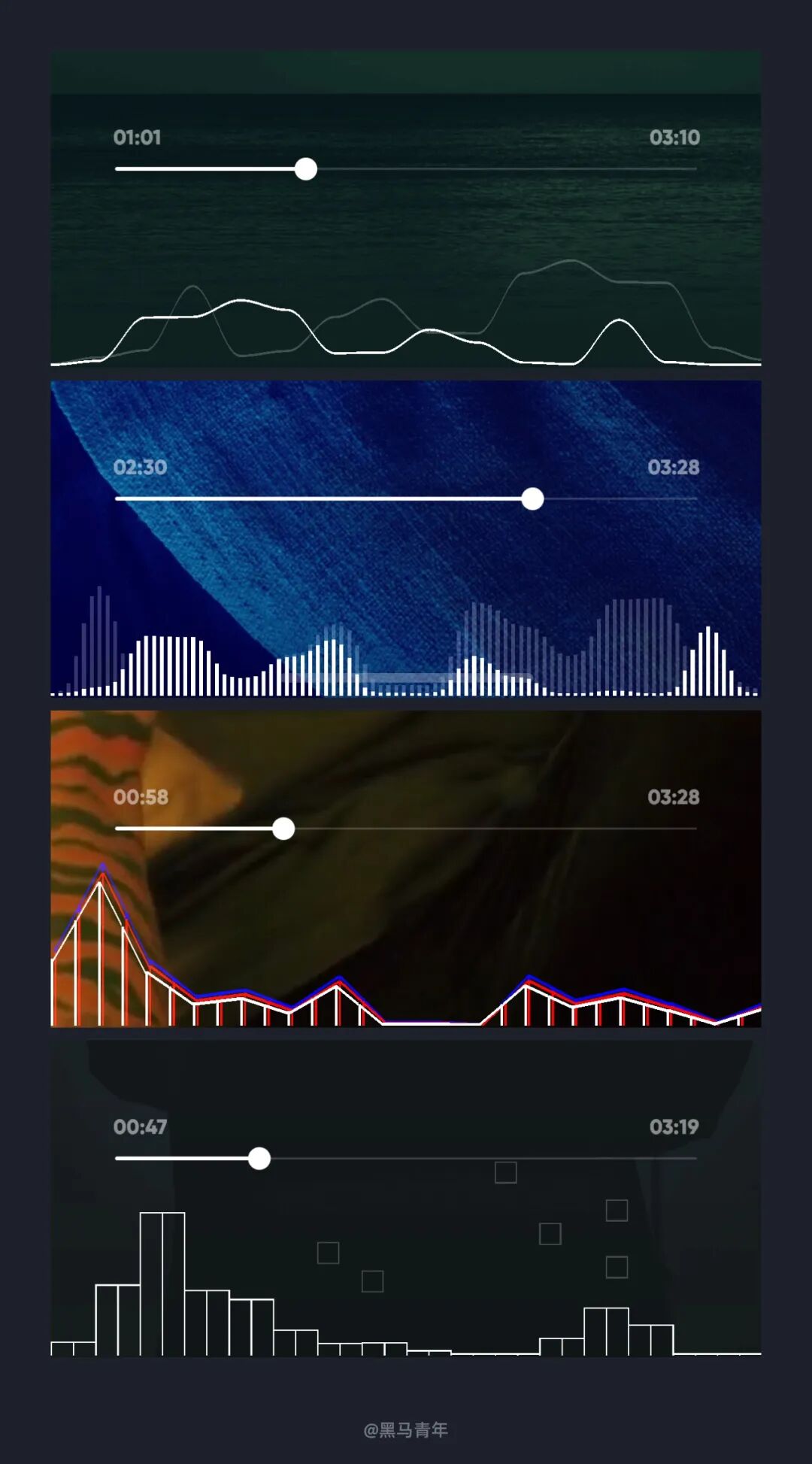 MOO 音乐在播放界面设计中,底部配合音量的大小弹出音频波动条,带给用户视听双享受。音频波动条采用不同的元素进行设计,体现不同音乐的差异,带给用户独特的感官体验。差异化的设计表达也能打造独特的记忆点,让用户在众多的音乐产品中形成独特的记忆。