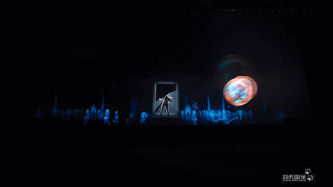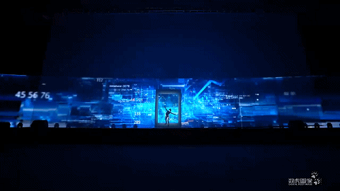 来到《移动互联网时代》,舞台上的机械臂由一个变为两个,屏幕组合成折叠手机,激光铺设全场,营造数字海氛围,现代舞者与机械臂通过互动创意表达移动互联网时代的一个个金融行业里程碑事件,让观众看到移动互联网时代金融带给人们的便利。当舞者消失,再次完成真假人切换,观众开始期待接下来的表演,情绪处于上升期。