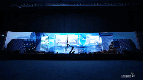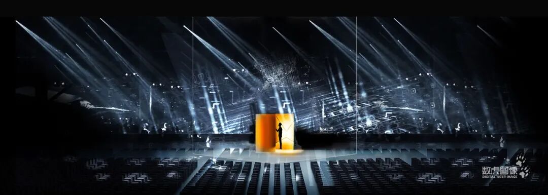 在技术上,多重技术和谐共生于舞台。LED屏幕、程序激光、联动灯光、XR特效、纱幕呈片状或呈90度折角状成像、2套机械臂等应用,使开场舞台呈现了多面的视觉效果,表现了金融的无限可能。