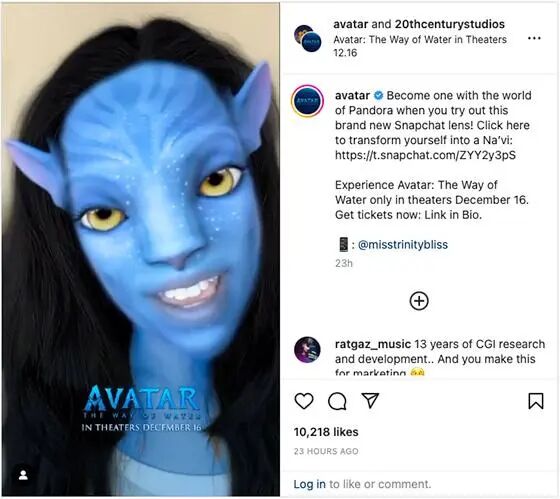 前些日子迪士尼宣布与 Snap 合作,在上映前推出阿凡达专属的 AR 滤镜。