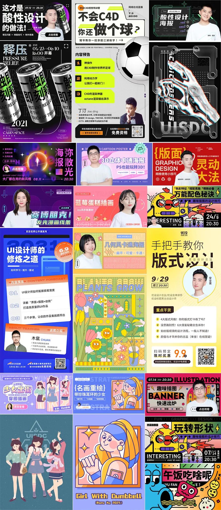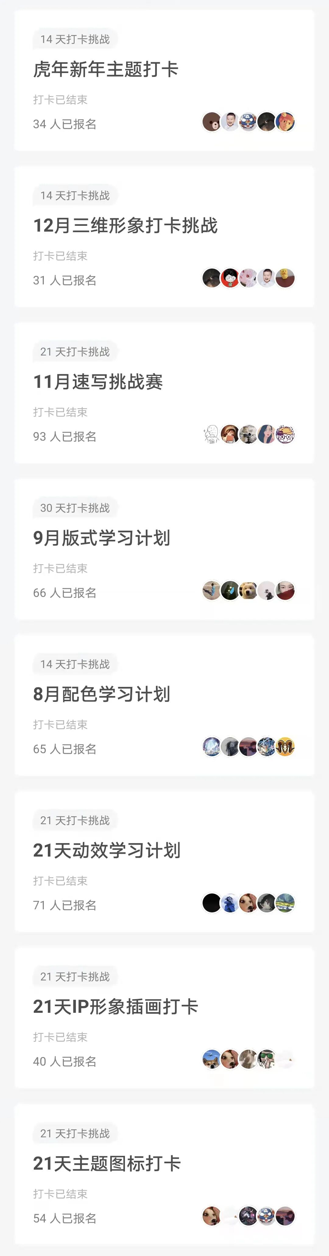从2021年5月至今我们已经举办了10场以上的打卡主题练习,涵盖动效、手绘、C4D、IP人物、版式设计等不同方向,即使你是零基础也可以参加。