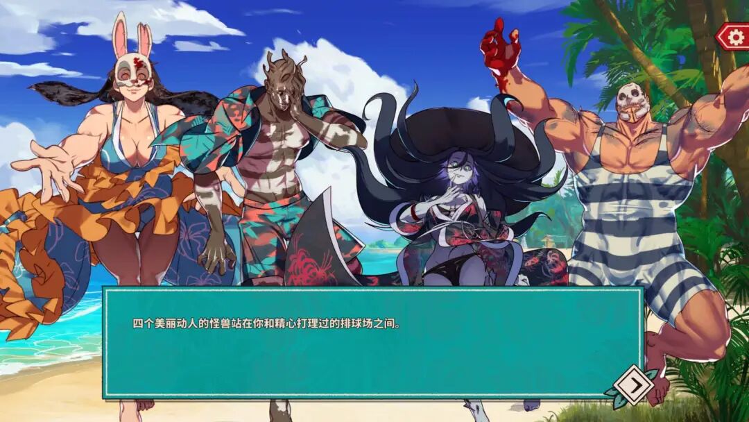 玩家沙滩上醒来,然后就会遇到四名攻略对象,也就是《黎明杀机》里的四位杀手:女猎人、幽灵、怨灵、设陷者。