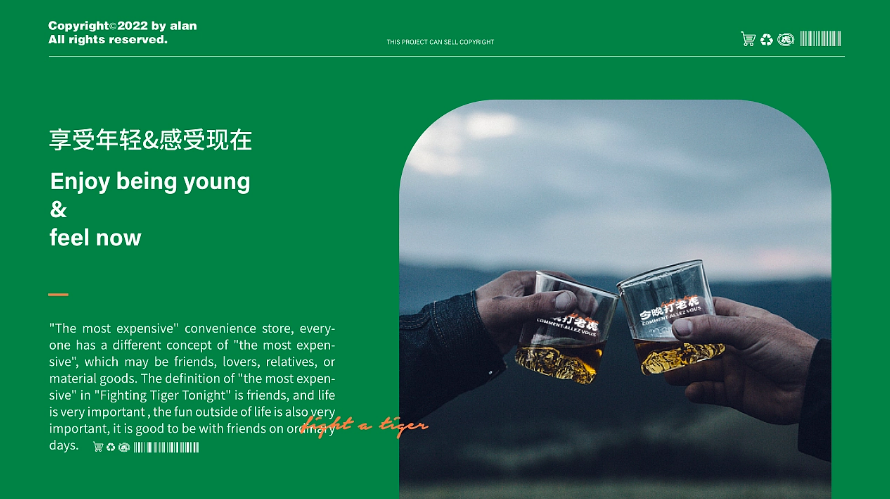 享受年轻、享受现在,「今晚打老虎」便利酒馆,带你喝上一杯“最贵”的酒!每个人对“最贵”的定义不同,可能是朋友、爱人、亲人,或者物质,而在「今晚打老虎便利酒馆,“最贵”的就是朋友,生活很重要,生活之外的乐趣也很重要,在平凡的日子能和朋友在一起就好。