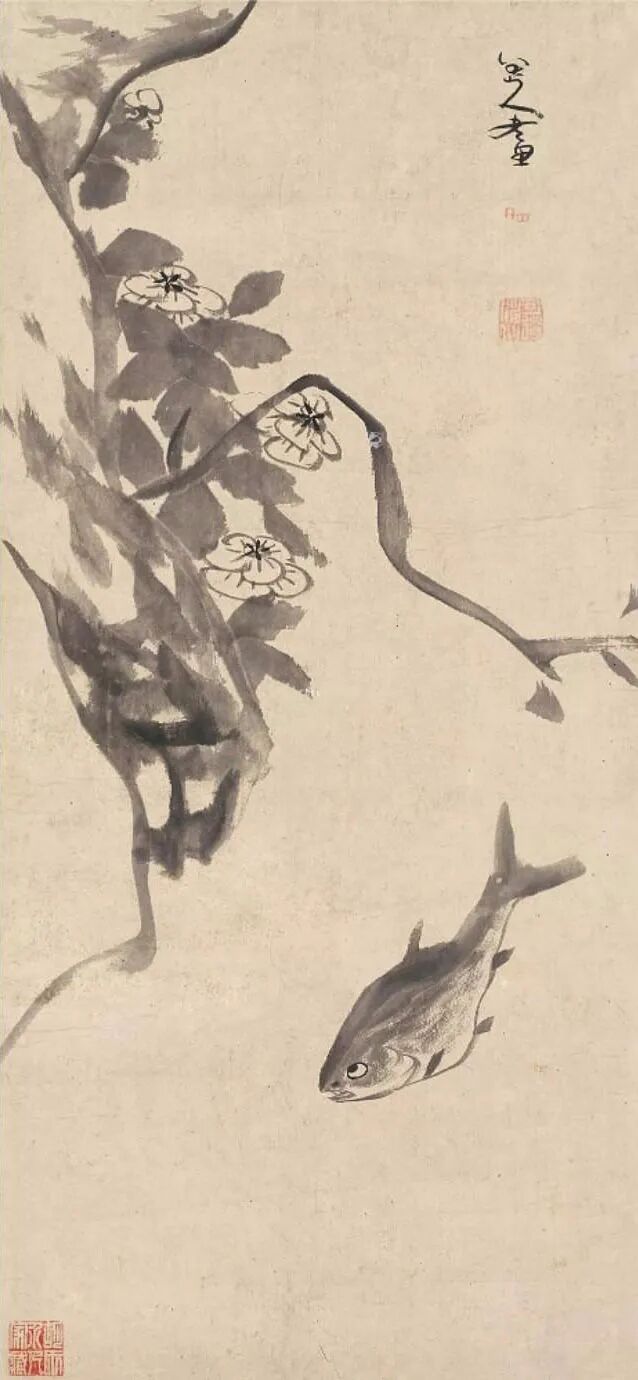 八大山人画鱼,有独特的章法和内涵。他用极简单的构图与用笔,不必染水而自有鱼在水中的意态。