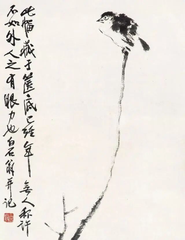 虽然整体画风虽类八大,但画中的小鸟并不像八大作品中那般孤傲、惊愕,反而有些许温情在其中,少了八大的刚劲,也附有李苦禅自己理解的味道。