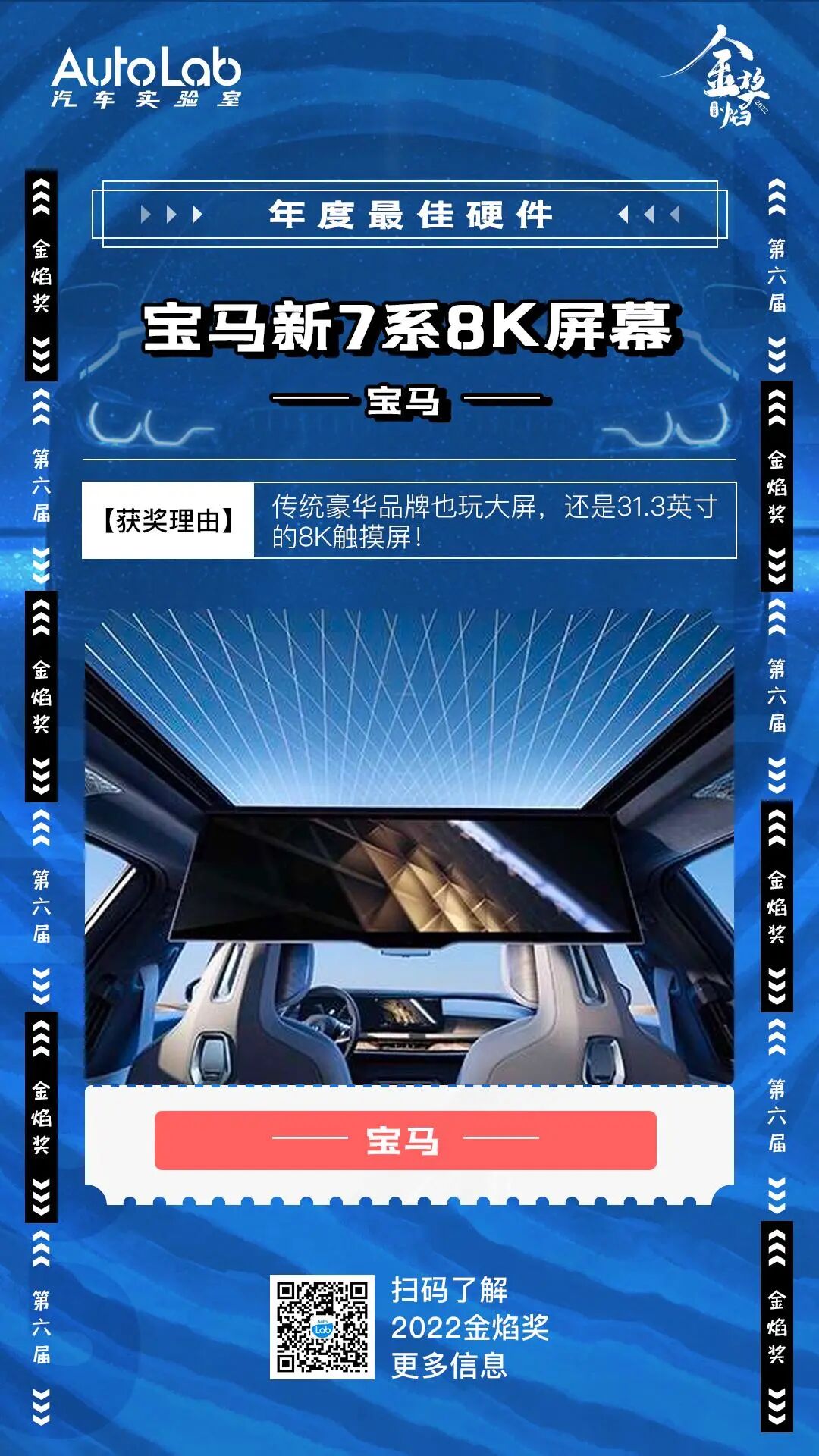 获奖理由:8K屏幕是宝马全新7系的一大卖点,其后排配备的8K影院屏幕宽度接近1米,同步支持触控操作,也能一键开启影院模式,坐在后排看视频、玩游戏之类的娱乐体验完全都能够满足。