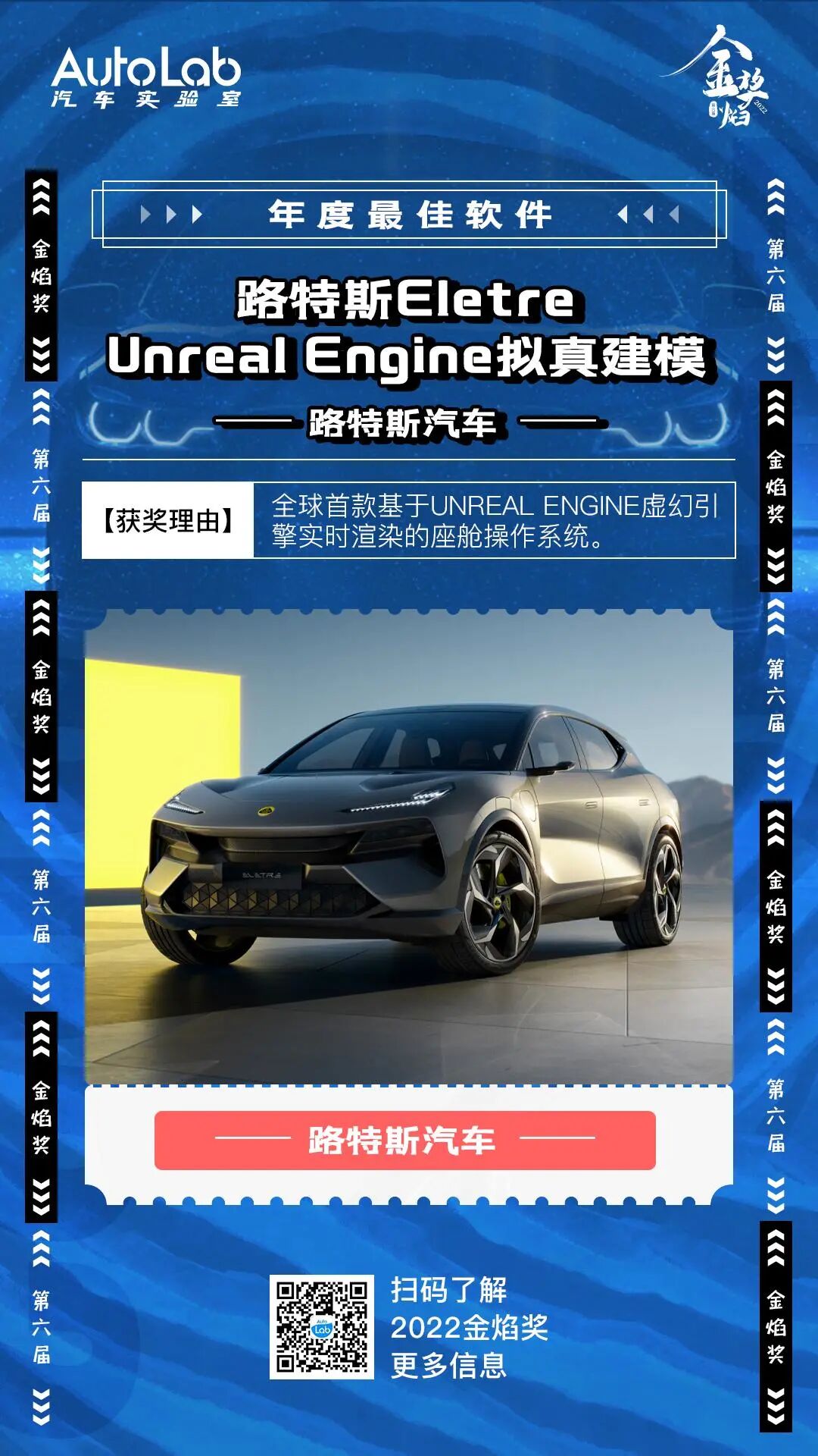 获奖理由:路特斯Eletre的 Lotus Hyper OS 车机系统是全球首款基于UNREAL ENGINE虚幻引擎实时渲染的座舱操作系统,运用虚幻引擎技术可以让其车机3D场景拥有更逼真细腻的质感,其3D模型的细腻程度,光影渲染的表现力上均属于顶级水准。
