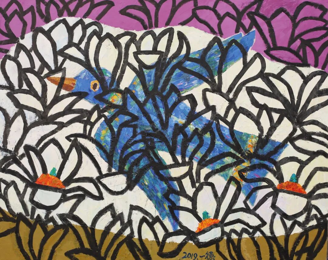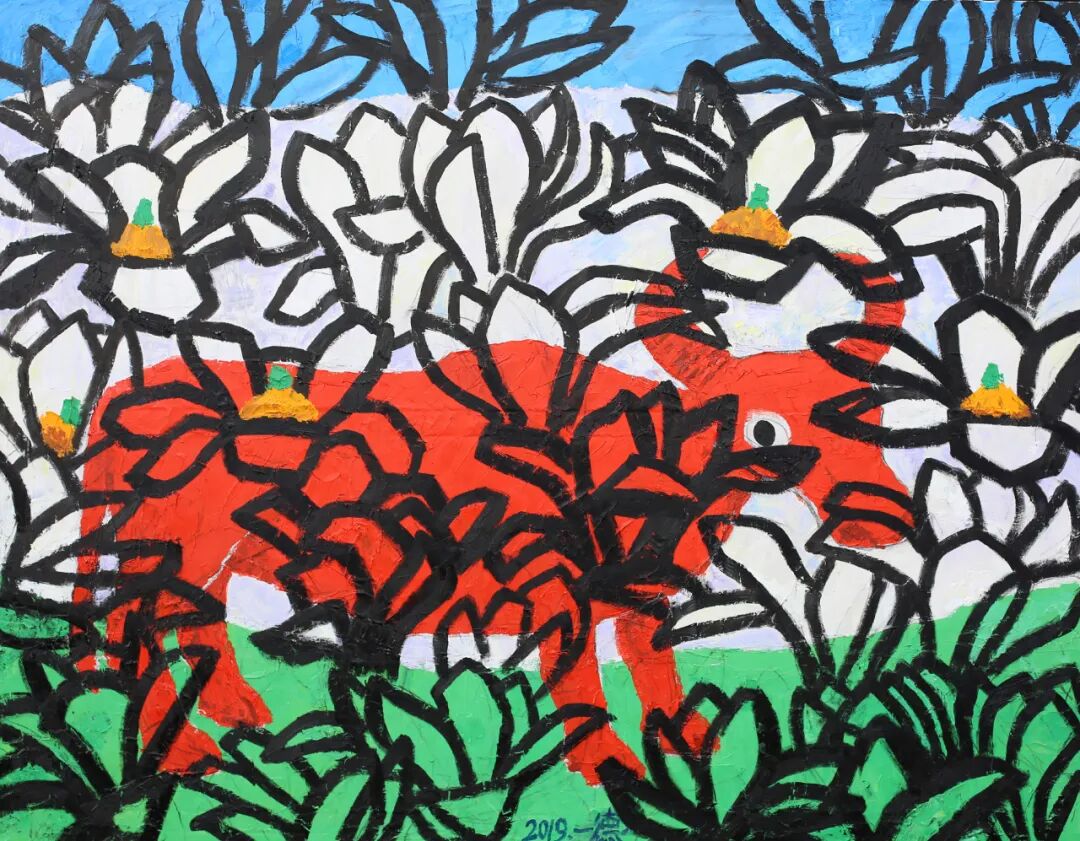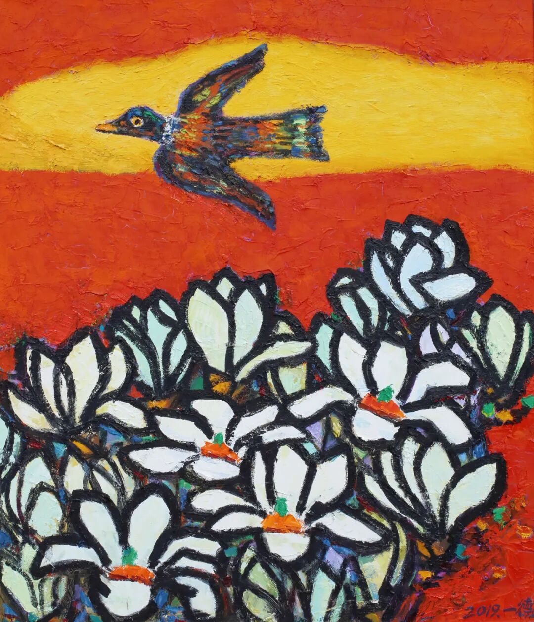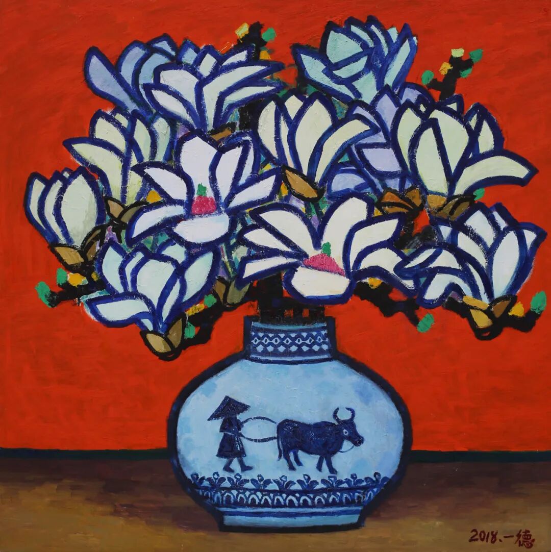 这些作品给我的第一印象是画家喜欢以玉兰花为题材,也喜欢以玉兰花勾线作为自己的表现语言,也尝试用多种表现手法来突破自己。我比较喜欢有花瓶的画面构成。较难判断艺术家的年龄、性别、艺术学习背景和性格特征,隐约觉得,女性的可能性大。瓶式静物花卉的这种画作,适合挂在书房、居室里,清供的方式,有清雅之气、装饰之味,让人赏心悦目,也更符合大众审美。以白玉兰勾线作为构成,后面衬以色块,甚至穿插牛、鸟这些物象,这样的画面适合相对现代一点的公共空间,或者年轻人的工作、生活空间。