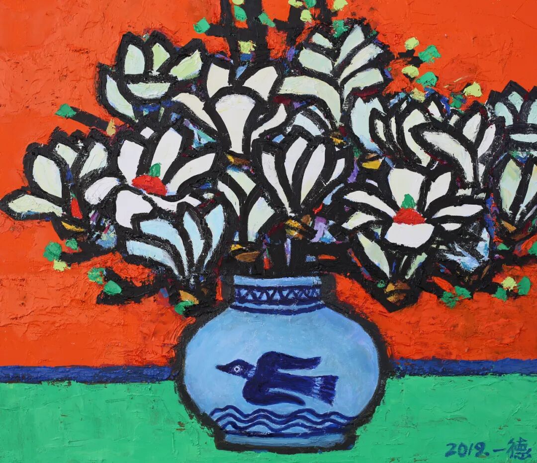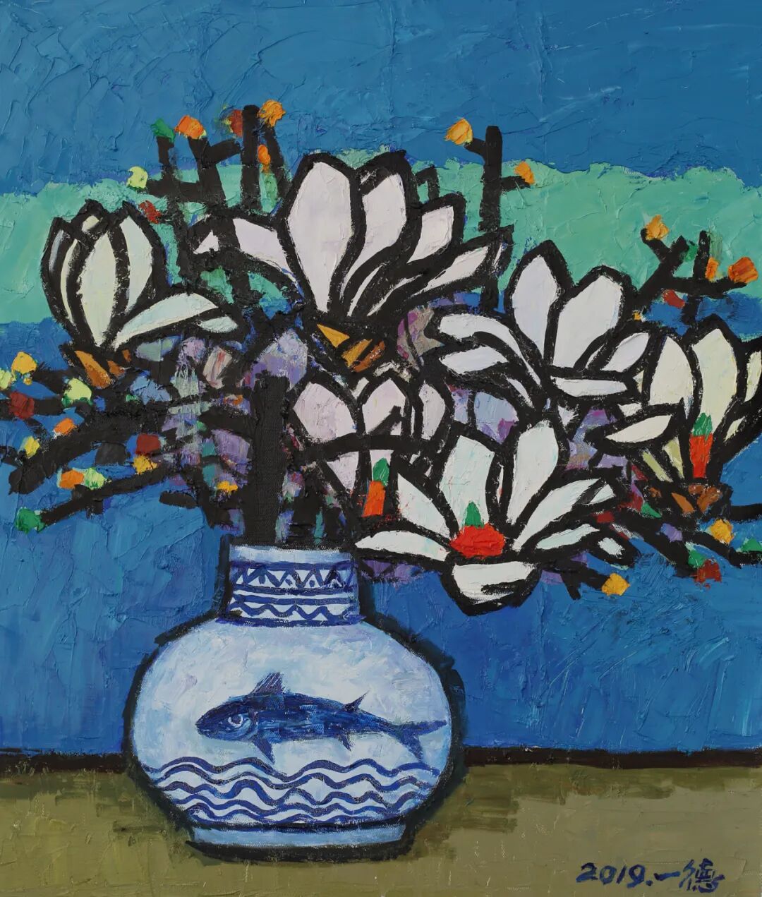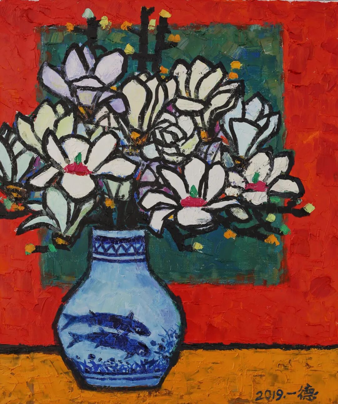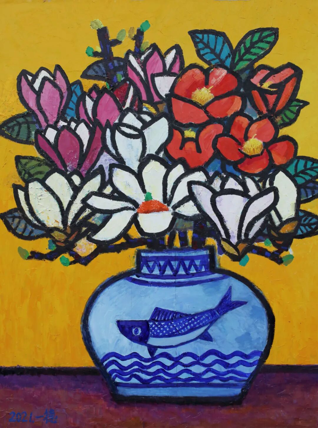 艺术家的玉兰题材和表现手法都谈不上新,似乎上世纪初留洋归来的第一代画家常玉等人就有这种画法,但从审美心理而言,我更喜欢以花瓶形式呈现花卉。花瓶的色彩与玉兰花、茶花之间形成了一个对比,丰富了画面。花瓶上面的鸟兽虫鱼,使画面在静物当中多了一点动感。花瓶里的玉兰花,作品中有不同的表现方式,有的用粗重的黑线勾勒,有的纯粹用色彩表达,这两种方式各有各的味道,但过于繁复粗重的黑线让人不适,我尤其不喜欢缺少疏密对比变化,构图平板,线条杂乱,没有穿插的那几幅作品。相比较而言,不用黑线,哪怕没有清晰笔触,没有轮廓的几幅作品都较之赏心悦目,但这样的作品又会有行画之嫌。