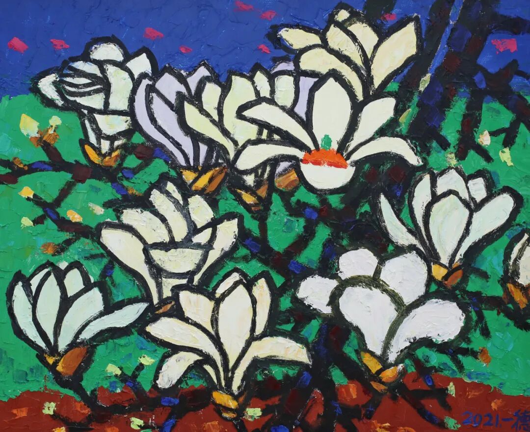 作品具有强烈的个人特点,估计是一位资深男性油画家。他将中国画的线条元素融入西画造型,从而成为自己的绘画语言。作品题材以玉兰花为主,画面具有装饰性;色彩或强烈对比,或和谐统一。线条浓重,落笔肯定有力;作品充满了对生命绽放的渴望,但有的作品又略带忧郁。我认为作品具有独特的美感。作者勇于探究,敢于创新的精神是值得学习的。个人认为,作品摆放在具有西方情调的咖啡馆及音乐厅等场所比较合适。