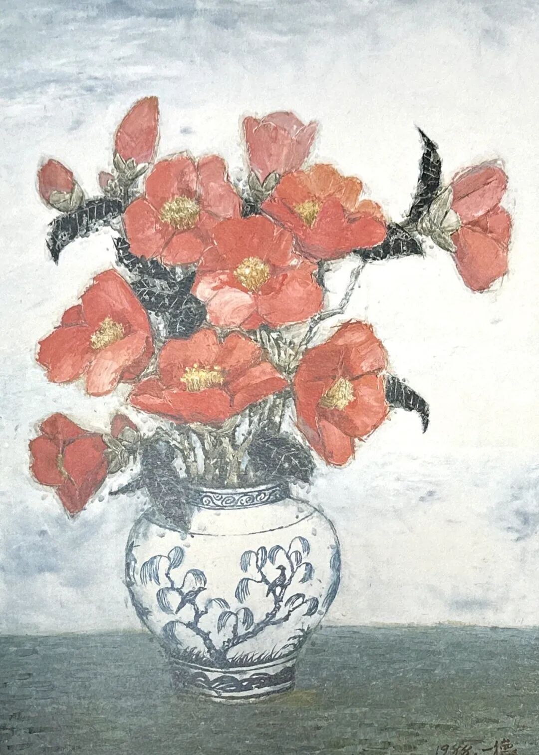 初步判断应为女性画家,40-60岁,温婉,文艺,感情细腻,爱生活。整体感觉画面具有很强的温馨感,是美好幸福生活的展现。但构图较固化,鲜花插花瓶,花瓶上绘制鱼形、飞鸟、麒麟兽的图案,图案建议神似即可,让欣赏者有些想像空间。