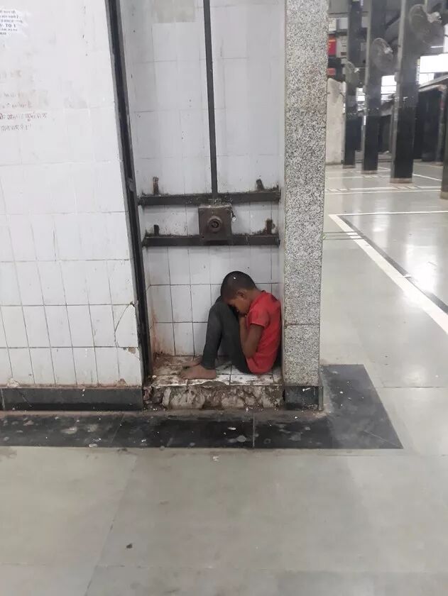 一个孤独无助的孩子在孟买尼鲁尔车站的角落里睡着了。