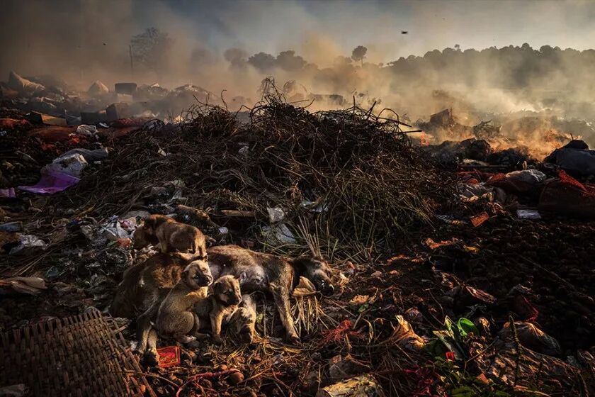 我在垃圾场的火灾过后拍下了这个场景。起初我以为母狗正在为她的几个孩子哺乳,但走近却惊讶地发现,她已经在火灾中不幸伤亡了。这一幕让我倍感震惊:多么伟大的母爱啊,让她在至死都在照顾自己的孩子们!