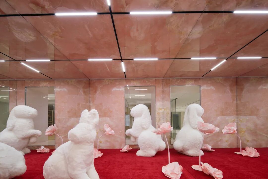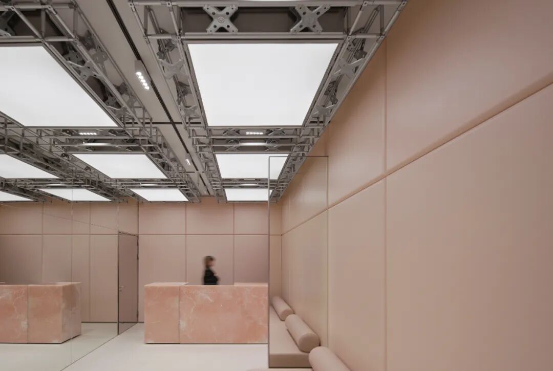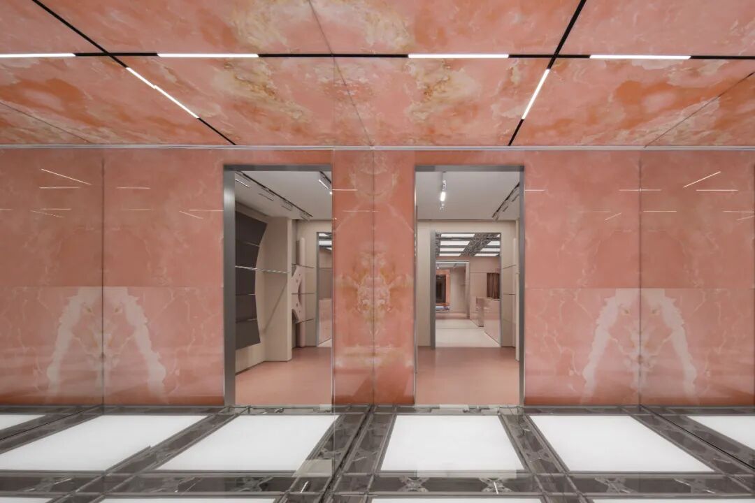 墙面与天花一体的粉色石材创造梦幻的空间肌理;通过抬高地面、降低天花与两侧镜面反射的结合,形成无限延伸的视觉效果;发光的地面消除了空间局限带来的压迫感。