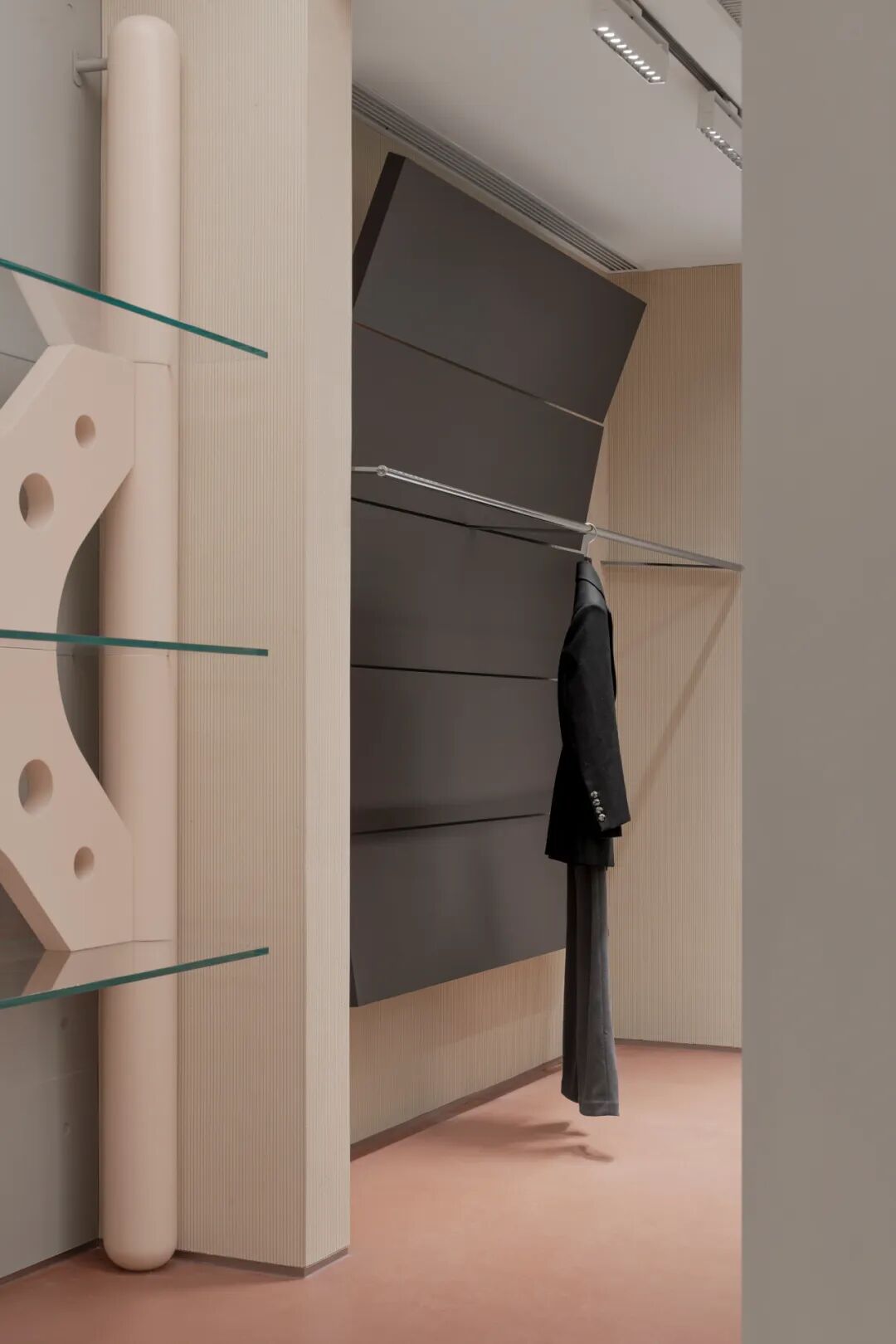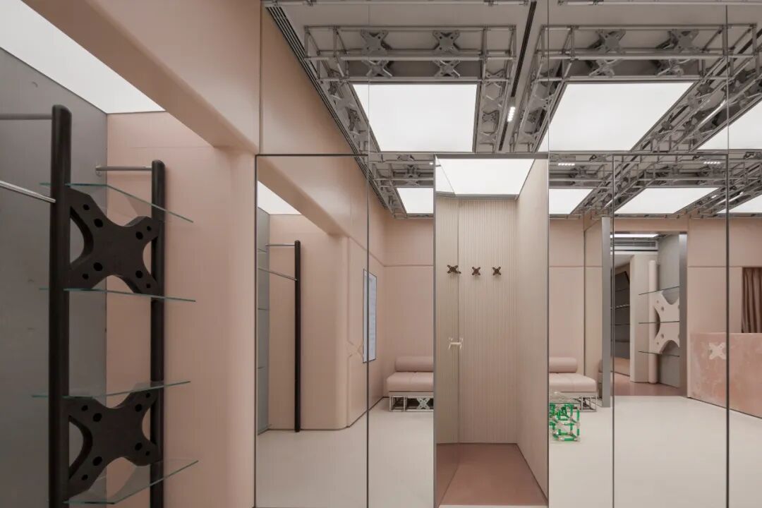 试衣间与仓库隐藏在镜面后,极大程度地拓展空间视觉,同时满足试衣的功能需求。以反映代替区隔,延伸着空间的尺度。