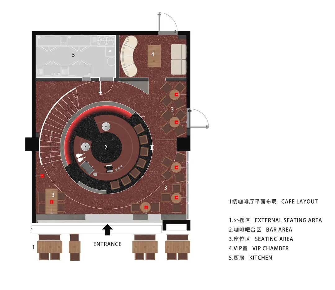 从入口处,进入"故事"的中心。圆形,是仪式的象征,是故事的创造。新的建筑体块——充满时间的象征性——在空间的中央创造多层次的关系,同时也塑造着空间的特征。空间分成上/中/下(酒吧/平台/咖啡)三个功能区域,也带来上楼与下楼的运动轨迹,产生时间的流动性。
