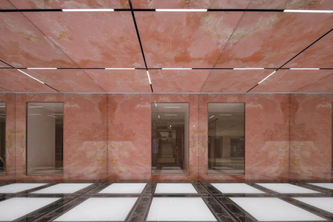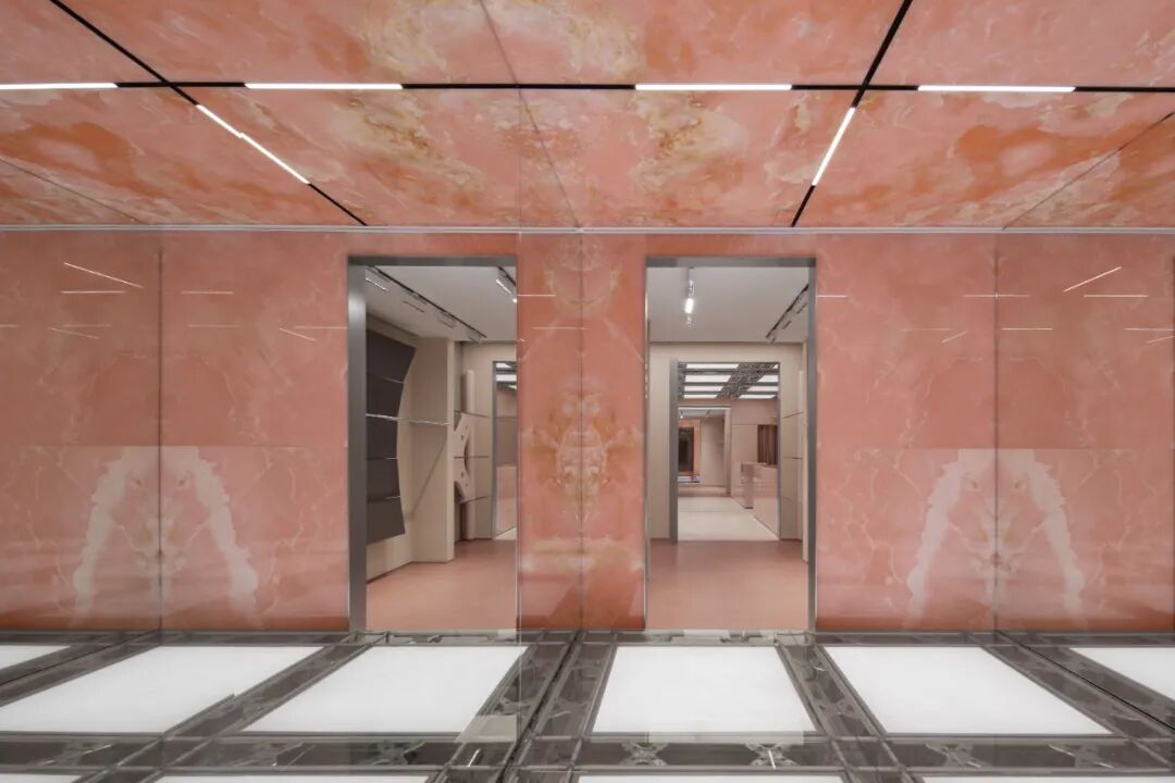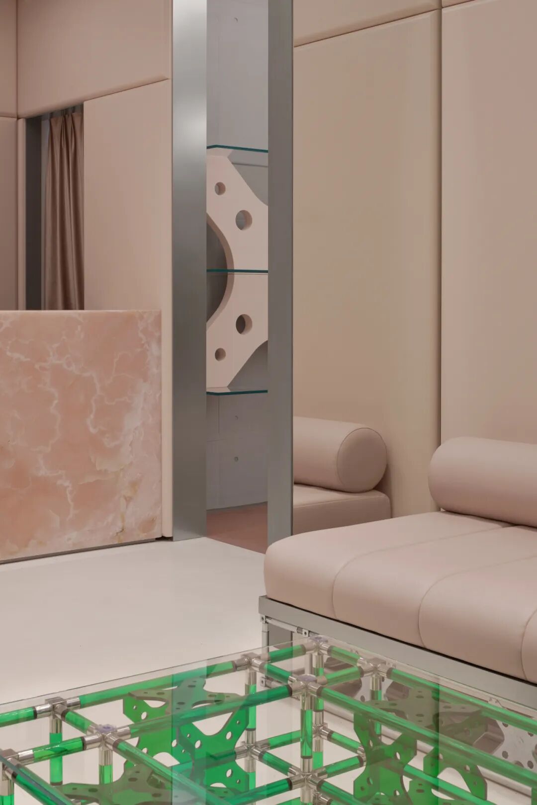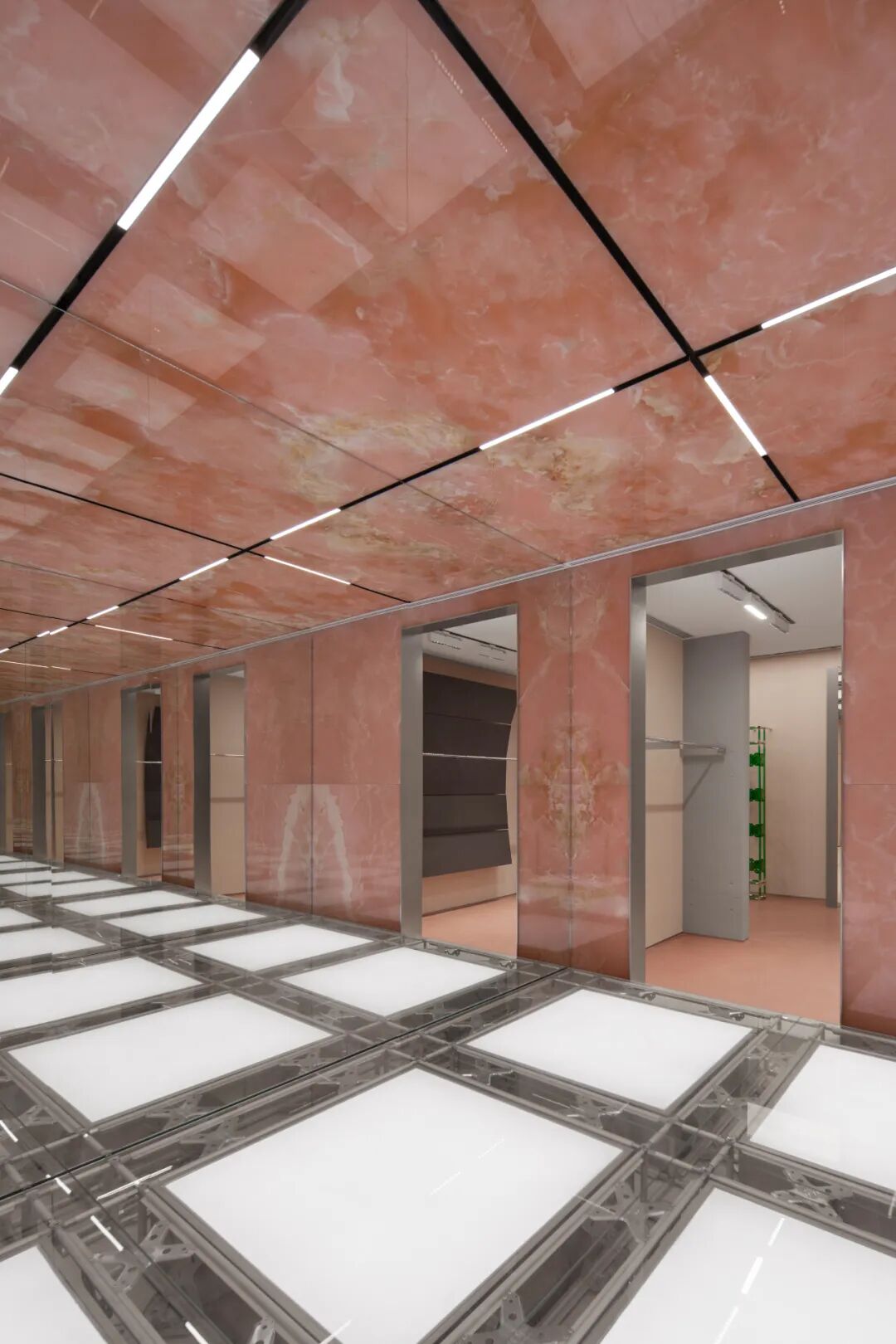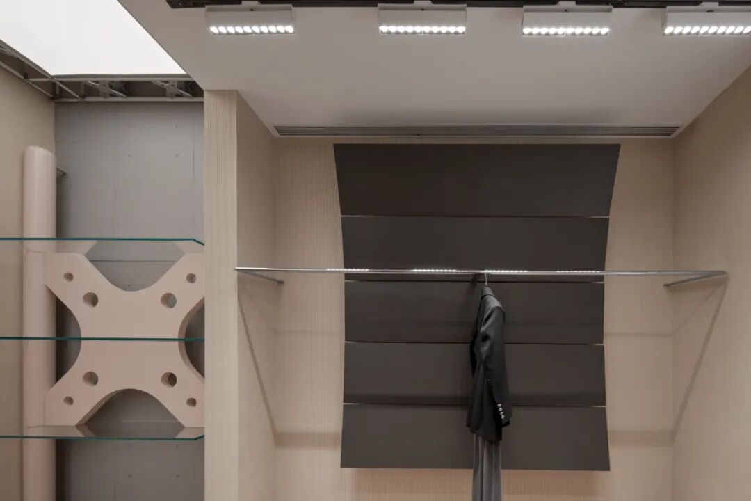 前区入口设置为一个相对狭长的陈列空间,深色弧形体块增加空间的对比度,作为服饰的陈列背景,聚光灯与幕墙于一种聚焦的呈现创建“舞台”的场景,呈现理性精致的表达。